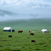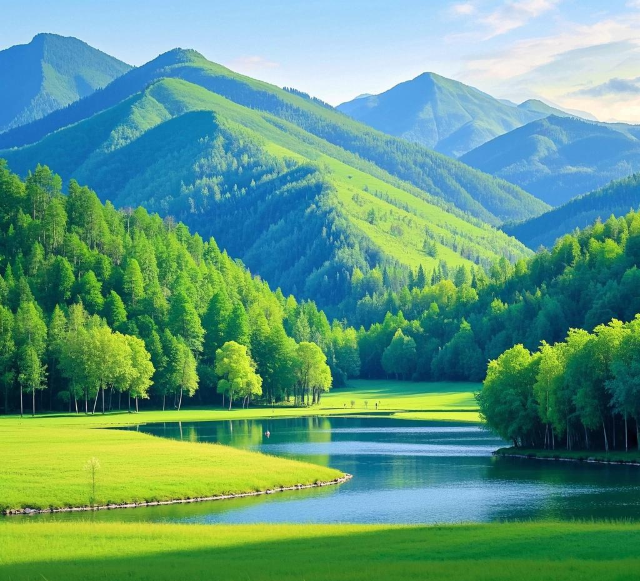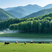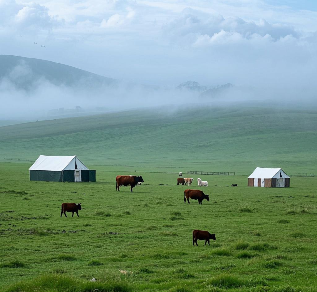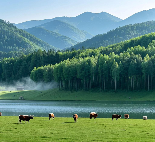景区内群山连绵,竹海摇曳,湖水清澈,草原广袤,构成了一幅如诗如画的山水画卷。尤其是那大片的草地,绿意盎然,仿佛是大自然亲手铺设的绿色绒毯。1号营地的清晨,薄雾弥漫,牛羊在其间悠然自得,宛如世外桃源。