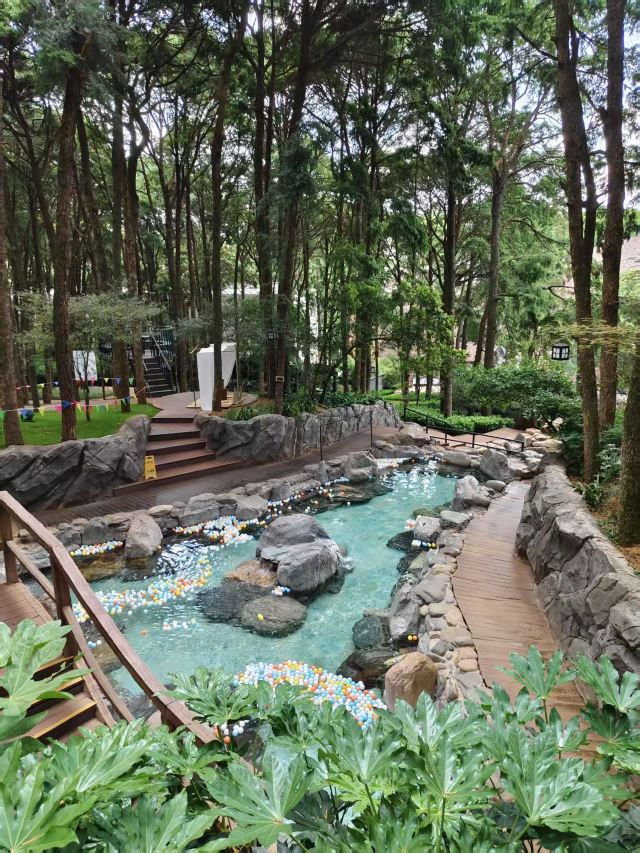 🌳 一进入金方温泉,仿佛瞬间踏入了世外桃源,满眼的绿树青山,空气里都是清新的草木香,负氧离子爆棚!园区里泡池分布得错落有致,被郁郁葱葱的绿植环绕着,完全不用担心被打扰。