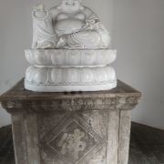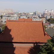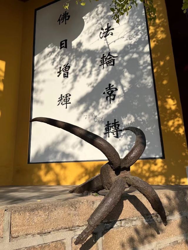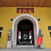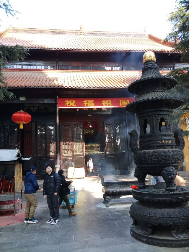 步入山门即为天王大殿,弥勒佛端坐神龛内,四大天王分列两侧,神态各异。拾级28阶而上,为赵朴初手书匾额的大雄宝殿。后为毗卢殿,神佛毗卢遮那和帝释、大梵两大天王,神色庄严,雄踞殿中,殿后是四海龙王朝观音的“海岛”群雕。第四殿为藏经楼,珍藏有明光宗敕赐描金《妙法莲华经》和素描观音大士像等瑰宝。