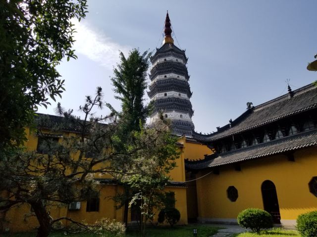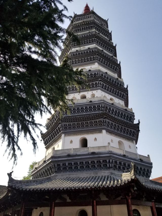 振风塔为八角七级楼阁式。砖石结构,呈圆锥形体,自底向顶按比例缩小,高达60.86米,中国国内仅次于河北开元寺砖石塔。塔基直径19.25米,台基为须弥座式,高0.95米塔底周边为廊,深3.33米,廊周边有24根直径0.35米的檐柱。底层塔身直径为8·72米(以上各层依次递减),壁厚3.87米,内室直径4.85米,供奉一座5米高西方接引阿弥陀佛。顶为八角覆盆式藻井(以上各层顶藻井均为此式)。塔的二层供弥勒佛,三层供五方五佛,三、四、五层有砖雕佛像600多尊,最多的四层有417尊。塔身嵌有碑刻52块(其中三层有35块)。