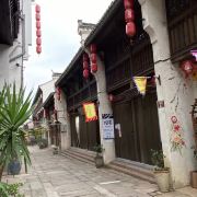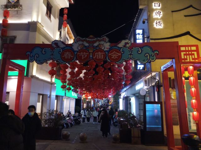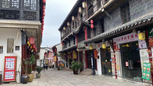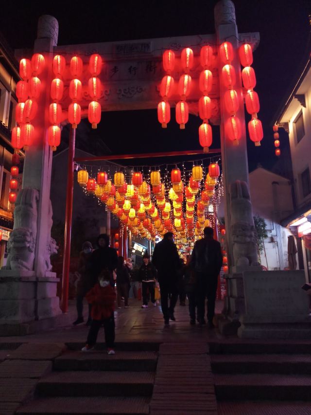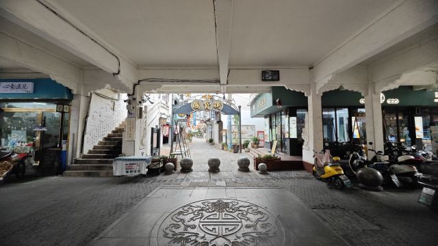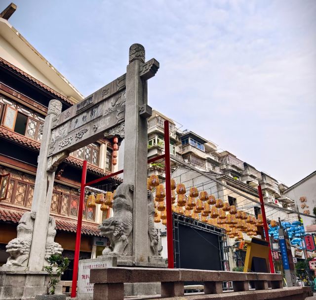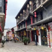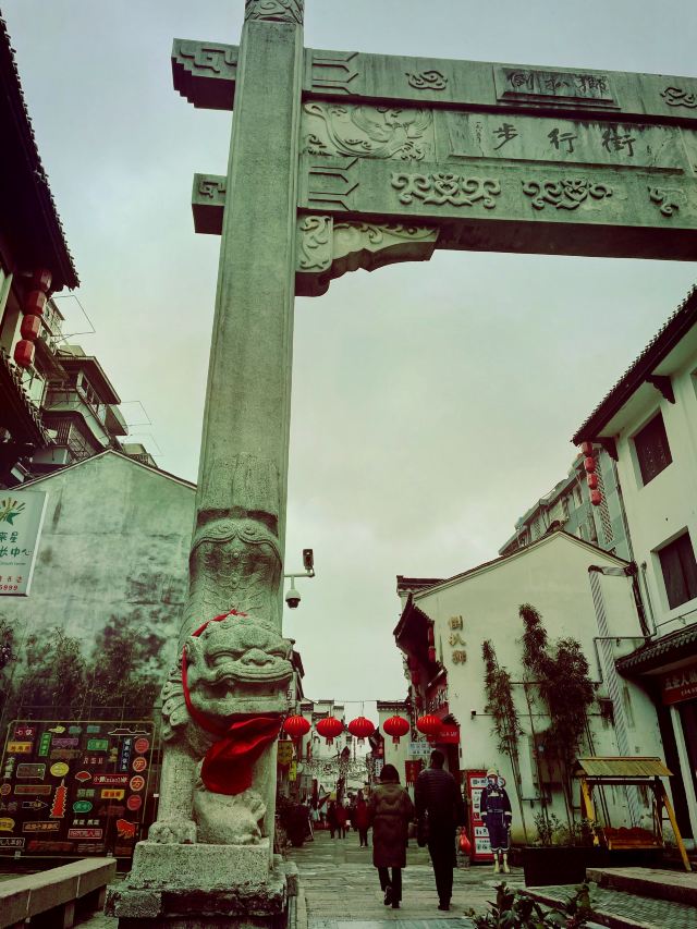倒扒狮牌楼又名黄门坊,糸明隆庆五年进士刘尚志所建。当街而立,面向东西,四柱三门,坊额两面题刻,一为“黄门司谏”,一为“青琐纳言”,两侧柱上各雕两只倒扒狮子,坊上镂雕的窗棱纹和云龙纹饰可见明代石坊建筑雕刻风貌。古街长三四百米,宽三四米,始建于明末,繁华于清末民初,距今约有四百余年历史,其形成的老字号为龙头的繁华商业区,在当时是“安徽第一商业街”。