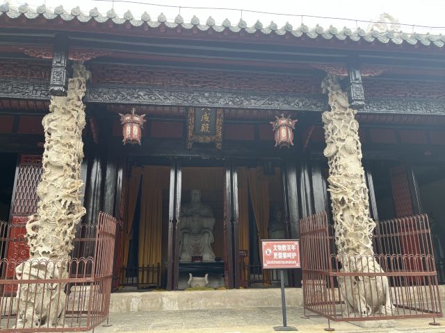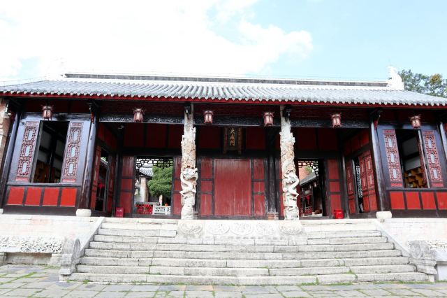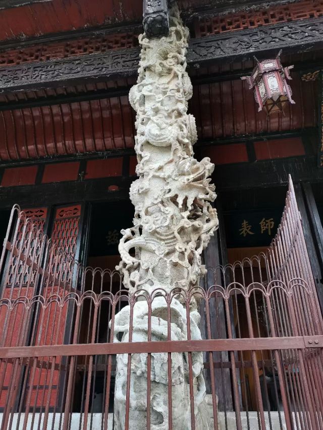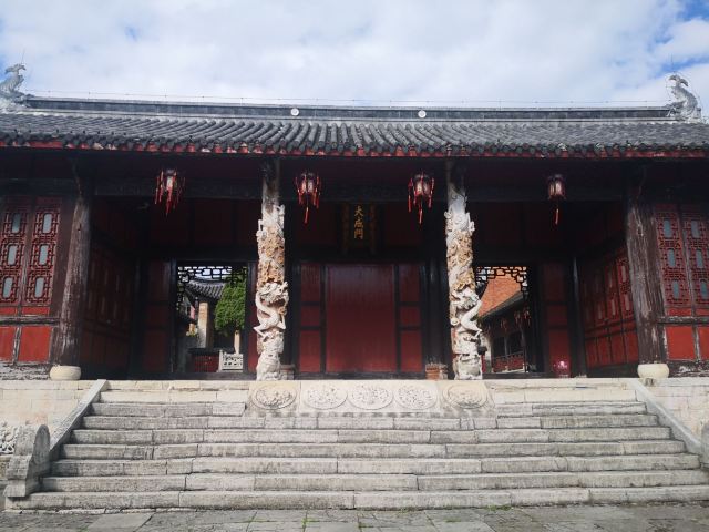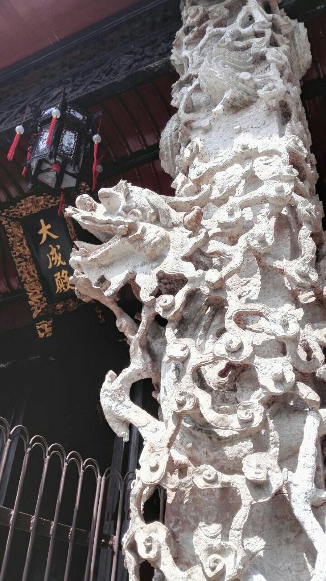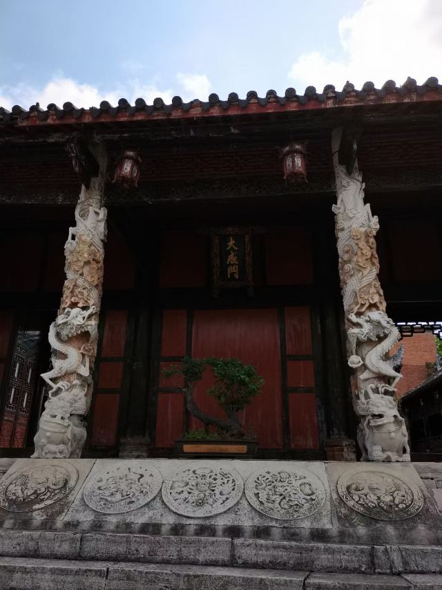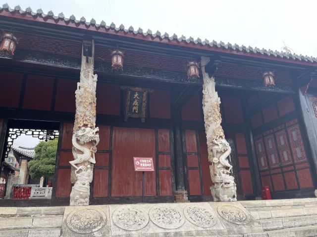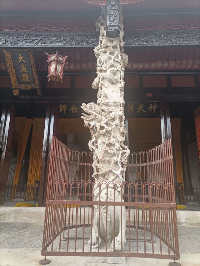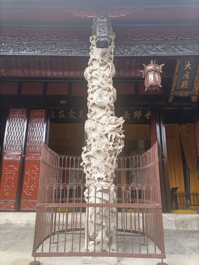 文庙共四进,除第四进被毁坏,其余三进都保存完好。由于依山而建,所以四进也是逐级升高。入正门的一个院落,有半月形水池,称为泮池。在古代,凡中秀才得从石桥上过,名“游泮”。院落东西两端,分别建有“桂香阁”和“尊经阁”,是祭祀时公布名单处。第三进是一座四合院。两条石龙宛如从天而降,龙身时隐时现,龙首遥相呼应,栩栩如生。柱础石狮为雌雄二狮,雄狮足蹬绣球,雌狮怀哺幼狮。它们与大成门外的另两根石龙柱,同被称为“文庙四大石雕瑰宝”。