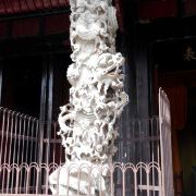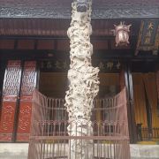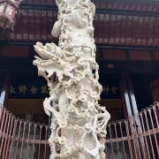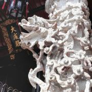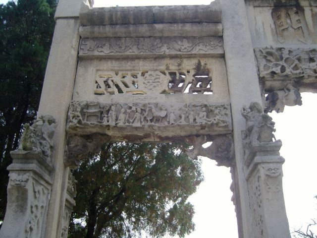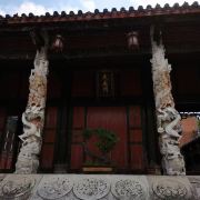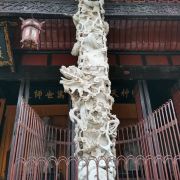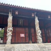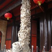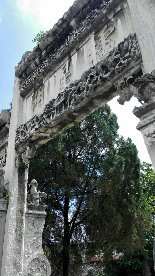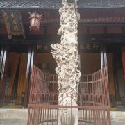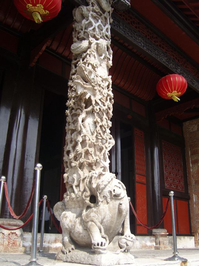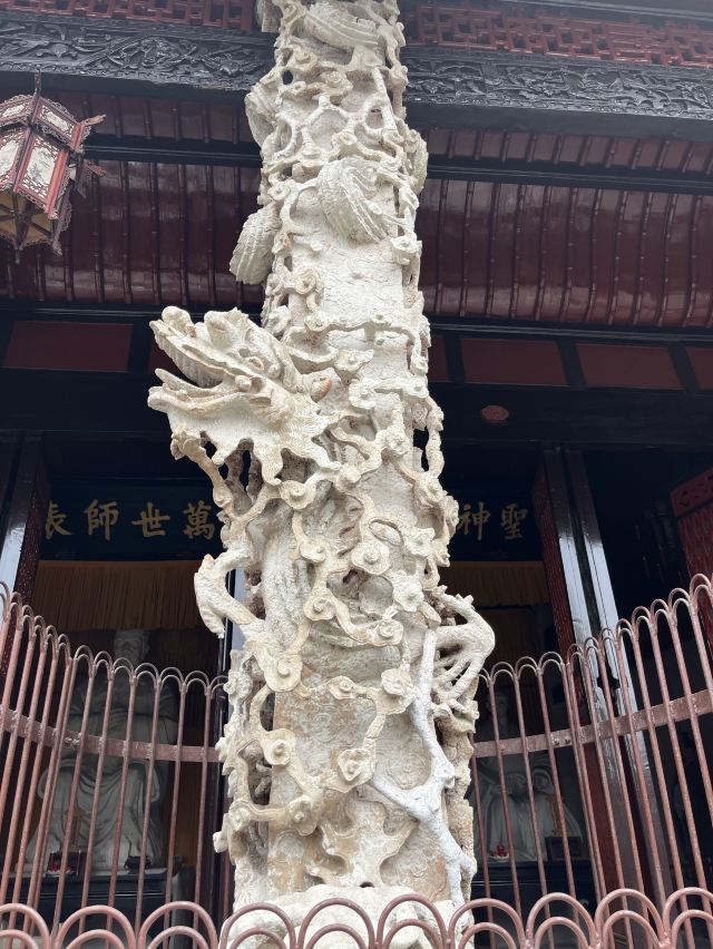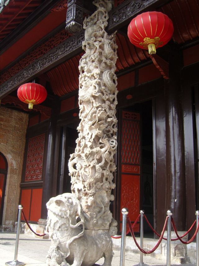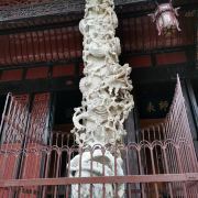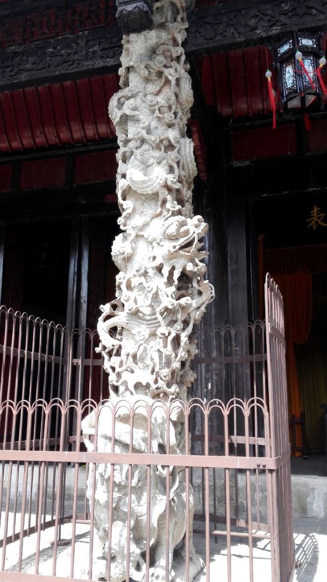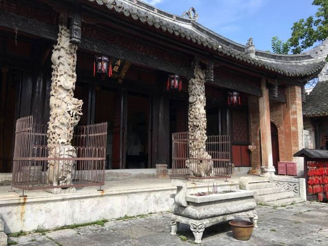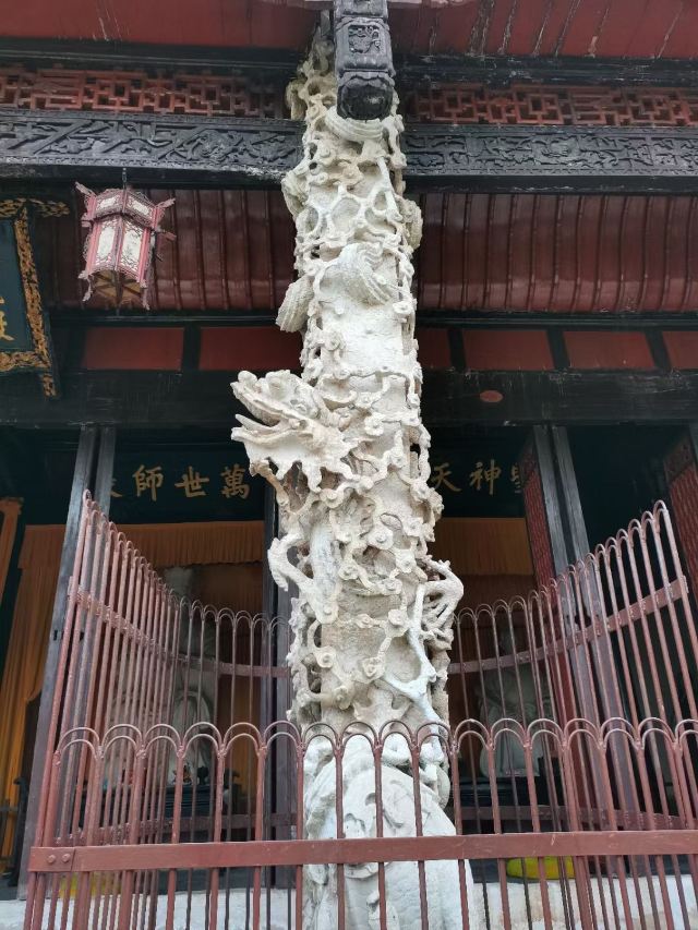 文庙共四进,除第四进被毁坏,其余三进都保存完好。由于依山而建,所以四进也是逐级升高。入正门的一个院落,有半月形水池,称为泮池。在古代,凡中秀才得从石桥上过,名“游泮”。院落东西两端,分别建有“桂香阁”和“尊经阁”,是祭祀时公布名单处。第三进是一座四合院。两条石龙宛如从天而降,龙身时隐时现,龙首遥相呼应,栩栩如生。柱础石狮为雌雄二狮,雄狮足蹬绣球,雌狮怀哺幼狮。它们与大成门外的另两根石龙柱,同被称为“文庙四大石雕瑰宝”。