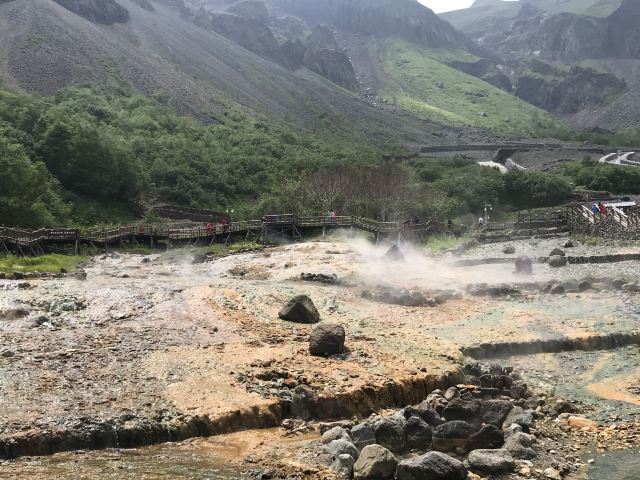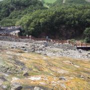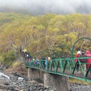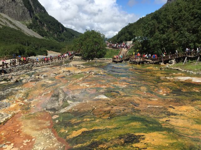 聚龙泉是长白山温泉群中水量大、分布广、水温高的温泉,在长白瀑布下方,这些温泉口遍布山体,形成壮观的地热景象。游客可行走于栈道,从各个角度欣赏这五颜六色的温泉带,还可品尝用温泉水煮的鲜嫩鸡蛋。聚龙泉分布面积非常广,二道白河从温泉群中间穿过,在河流方向的右方,泉口比较集中。由于无数条热流从地底涌出,似群龙喷水,故名聚龙泉。聚龙泉由于水温很高,水泡不断冒出,还能煮熟鸡蛋。用这儿的温泉水煮的鸡蛋,具有浓郁的矿泉气味,口感极好。
