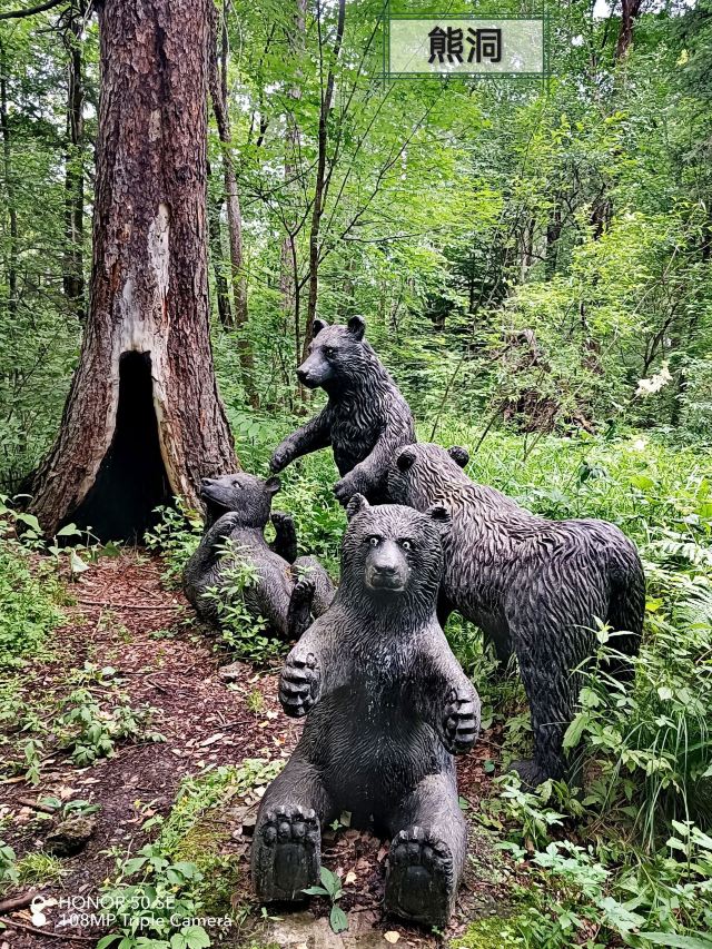 ⑧熊洞:熊所住的树洞布景,4头仿真熊憨态可掬。景物地图上通向附近“满族文化村(女真园)”和“朝鲜族风情园”的路已不存在。