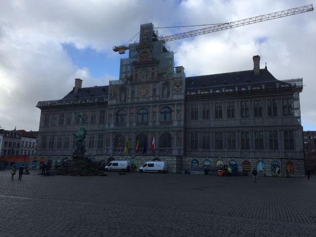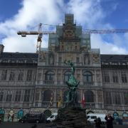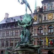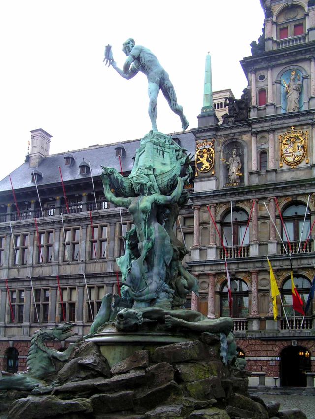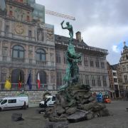 安特卫普市政厅外观插了彩旗,门前有一座名为布拉博(Brabo)的雕像,周边也有与其相呼应的文艺复兴建筑,一些建筑的一层开了各式各样的餐厅和纪念品商店,值得一逛!