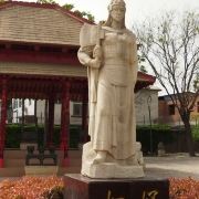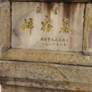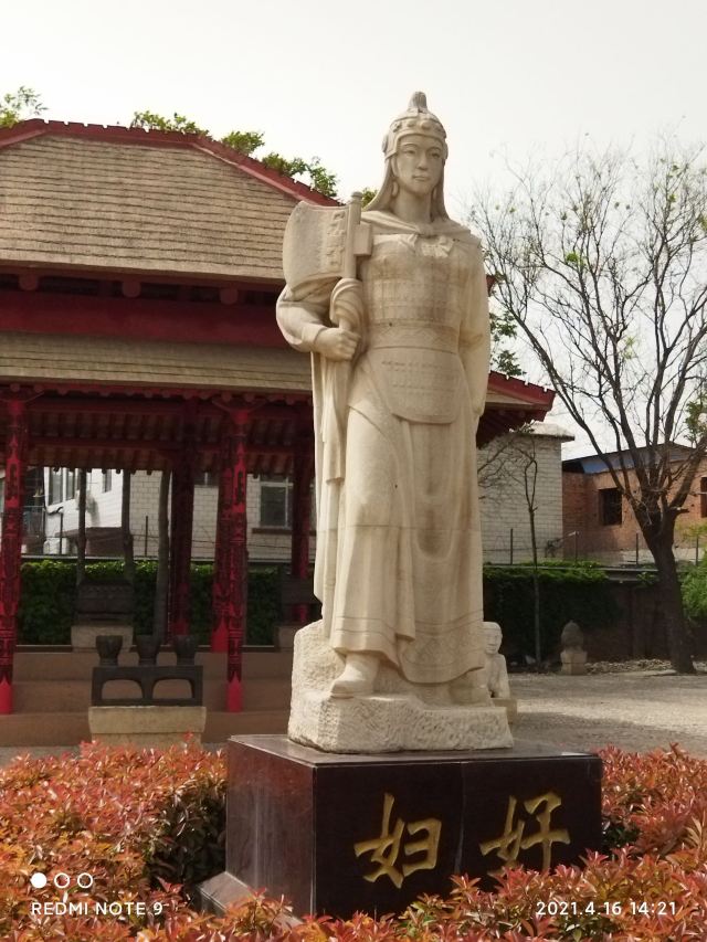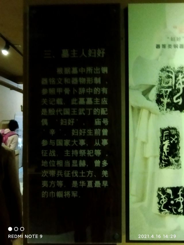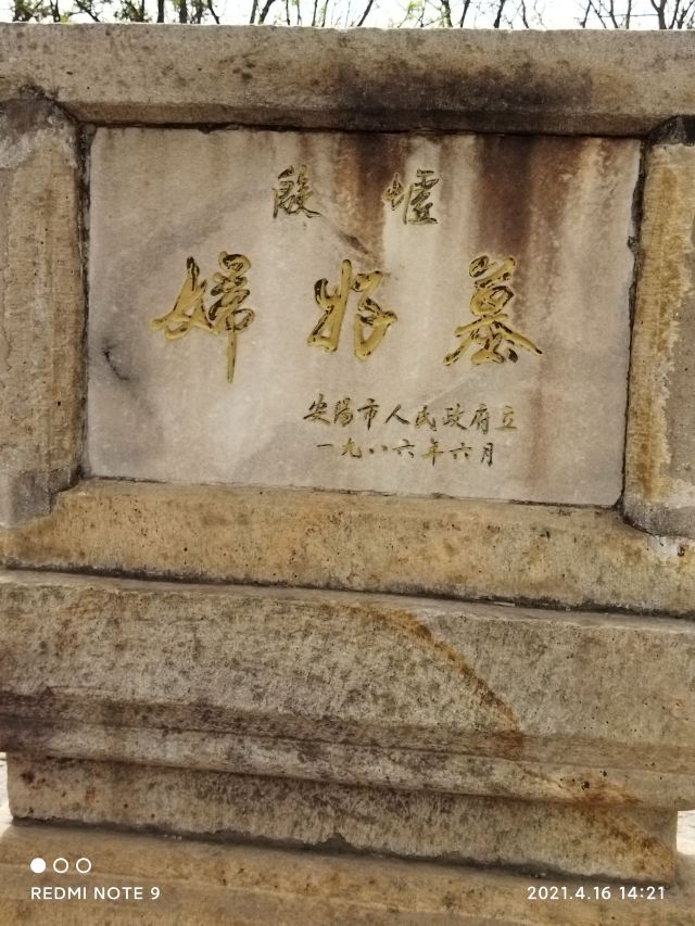 妇好墓即殷墟五号墓,位于殷墟宫殿宗庙遗址附近,是殷墟科学发掘以来发现的保存完整的商代王室成员墓葬。该墓是一竖穴墓,基口长5.6米、宽4米、深约8米,面积不大,仅为20多平方米,但随葬品极为丰富,共出土青铜器、玉器、宝石器、象牙器等不同质地的文物1928件,墓上建有被甲骨卜辞称为“母辛宗”的享堂。根据该墓的地层关系及大部分青铜器上的“妇好”铭文,考古学者认定墓主人为商王武丁的配偶——妇好。现位于妇好享堂前的汉白玉雕像是根据有关资料塑造的妇好形象,披坚执锐、目光炯炯,手持龙纹大铜钺,重8.5公斤,不愧为中国早的女将军,英姿飒爽、威风凛凛。而另一件虎纹铜钺重达9公斤,可见她武艺超群。在古代钺曾是王权的象征,这也说明妇好在殷商时期地位之高,很受尊敬。