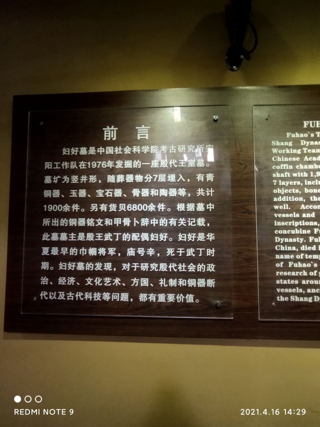 5分 超棒妇好墓在殷墟景区内,妇好是商朝著名的王后,传说能征善战,取得过很多次征伐的胜利,因此在商朝的地位非常高,她的墓不在王陵区而在宗庙区就证明了这一点。妇好墓内出土了很多珍贵的文物,为研究商朝的历史和文化发挥了重要的作用。妇好墓的入口很不起眼,进入后却是别有洞天,在整个殷墟景区也是一个不错的景点。