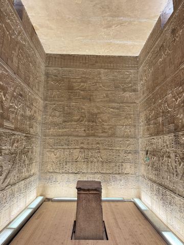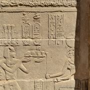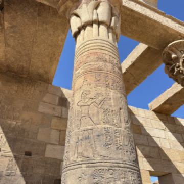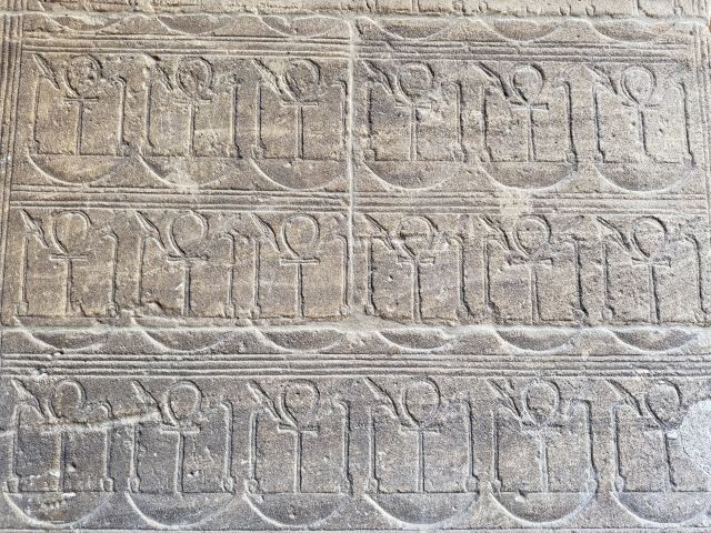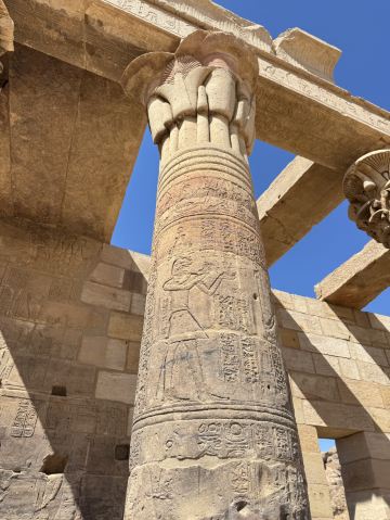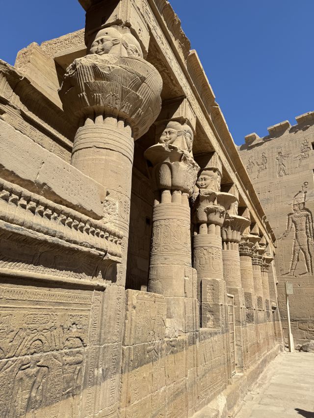 听完故事,我们用40分钟的时间参观了这座神庙。神庙的入口不宽,入口的两边是两尊狮子,因为自然风化的原因,狮子的脸已经看不清了。神庙内的一大看点就是雕刻在墙上的壁画,壁画的内容多和艾希斯有关。另一看点则是位于入口外部两侧的数根石柱了,每根石柱的柱顶造型各不相同,有莲花、纸莎草、花萼和棕榈叶,并雕有女神的脸。