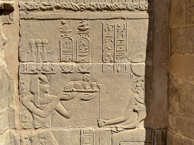 菲莱神庙供奉着埃及女神艾希斯。关于艾希斯,导游和我们讲了一个在当地广为流传的故事:女神艾希斯和他的丈夫奥斯里斯很恩爱,然而她的丈夫却被恶毒的弟弟赛特篡位杀害,并将尸体肢解后洒在了埃及各地和尼罗河中。艾希斯花了数年的时间才找到了丈夫尸体的全部,使其重生,而他们的儿子荷鲁斯也在长大后战胜赛特为父报仇。