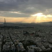🌅狼山的风景真的很漂亮,往远处看就是爱情海,让我差点忘了原来雅典也是一座海滨城市。我们刚上山的时候,天空还是湛蓝,夕阳未落,可以一览无遗雅典的市景和远处的大海。等到日落时分,落日点是在远处的高山后,即使看不到太阳,玫瑰色的晚霞还是给灯火初上的雅典市区披上了一层暖暖的金色,静静靠在栏杆上,看着脚下的城市慢慢点亮,看着着众神时代这片被神庇佑的广袤大地,不经感叹,爱琴海还在,克里特岛还在,只是这里曾经辉煌一时的希腊文明已经容颜不再。只有在雅典卫城上那些突兀的石柱和残败的墙垣在无言的述说着这里曾发上的一切。