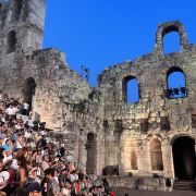 剧院整体为三层楼建筑 32排座位可容纳多达六千名观众 属于比较典型的半圆形露天剧场 剧场的任何一点都能够清晰的看到舞台上的表演 舞台的背景为罗马式窗型高墙 壁龛处以雕像作为装饰 设计非常的精巧 尤其晚上看起来特别有意境 有那种历史的厚重感