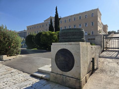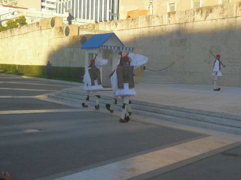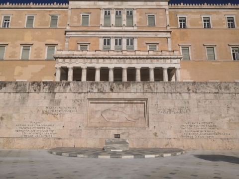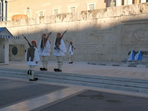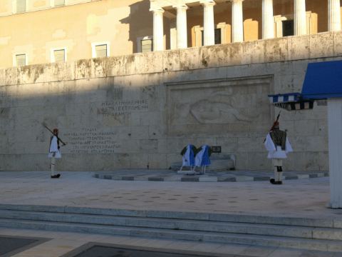 宪法广场上最吸引人的看点便是位于希腊议会大厦前的无名战士纪念碑(Tomb of the Unknown Soldier),此纪念碑建于1928年,是为了纪念在摆脱土耳其统治的战争中捐躯的希腊无名英雄。无名战士纪念碑的主体是无名战士浮雕,一个戴头盔的古希腊战士仰卧在一块石板上。浮雕两边镌刻着两句名言:“这里是全世界杰出战士之墓”、“是安放无名战士的灵床”。浮雕左下方刻有11个地名,右下方刻有12个地名,这些地名都是历史上希腊军队同外-队曾经进行过战斗的地方。每个小时在广场与议会之间的无名烈士墓前举行总统卫兵换岗仪式。在星期日和官方假日,大部分卫兵都参加换岗仪式,并有军乐队伴奏。