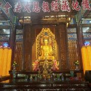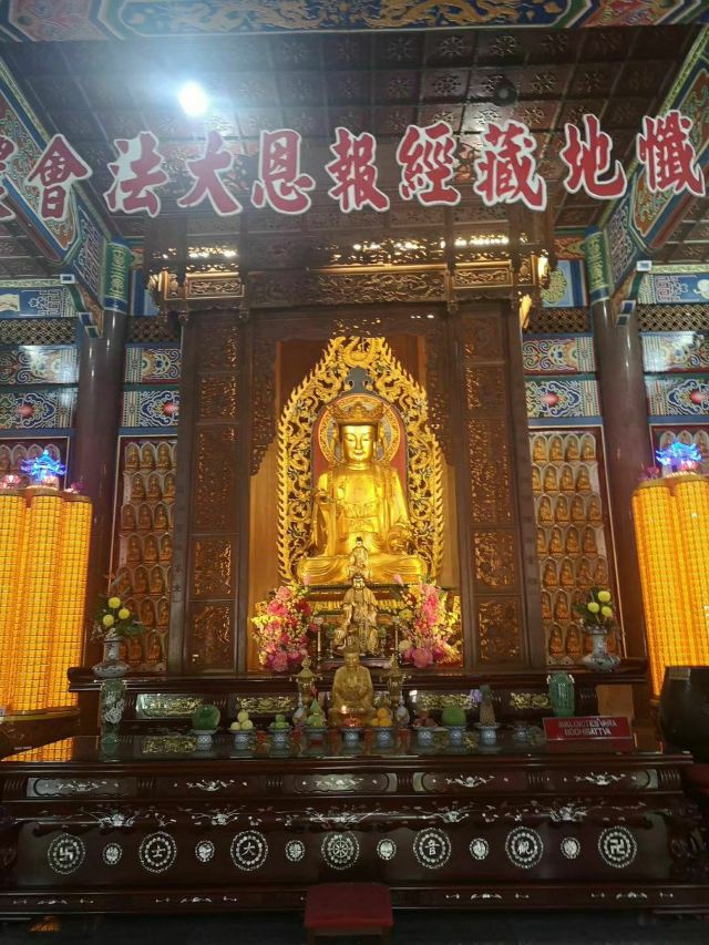 寺内五彩缤纷的建筑鳞次栉比,藏经楼里有万部经书,后院的万佛宝塔,设计十分奇妙,塔身素白,塔顶为缅甸式,中层为泰国式,而底部为中国式,外形和白蛇传中的雷峰塔相似,塔内每层都摆有大理石制的佛像及全身金箔的佛像,四大金刚和弥勒佛相当引人注目,坐、立、卧姿态各异。