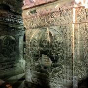 寺庙内部的四个石柱上雕刻着婆罗,围绕着错综复杂的花卉设计,而寺庙的外墙窗户周围雕刻着奈特(缅甸人信奉的守护神)。这里曾是关押孟族直通国的国王马努哈的地方,因此室内光线很暗,像监狱一样。