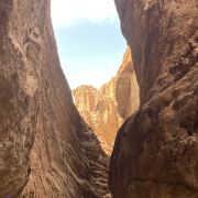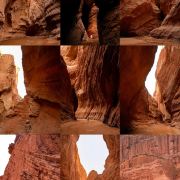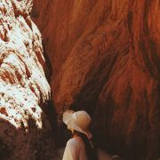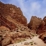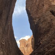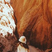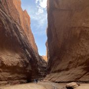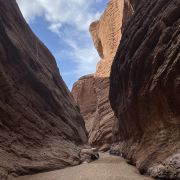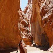 进入谷内,在红褐色的山峦中步行,仿佛进入了一个幽静清凉的世界。谷口十分开阔,但是深入谷中,峰回路转,时而宽阔,时而狭窄,有些地方仅容一人侧身通过。谷底比较平坦,许多时候都能够闲庭信步,两侧是高耸的石壁,脚下是细沙,不少路段还覆着一层浅浅的水,结着薄薄的一层冰。抬头仰望,在蓝天的映照下,奇峰异石千姿百态,数不胜数,神犬守谷、旋天古堡、显灵洞、玉女泉、卧驼峰等景观个个形态逼真。