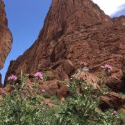 ①迎客景观:粉花花海与身后的大峡谷交相辉映,粗犷与柔美结合,是拍照点。
