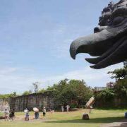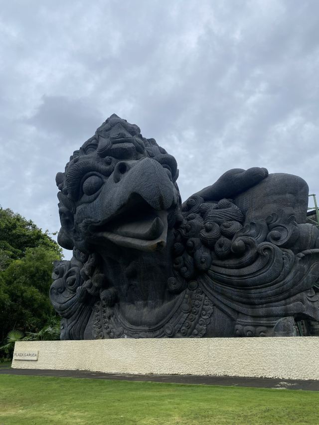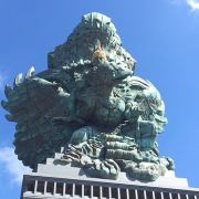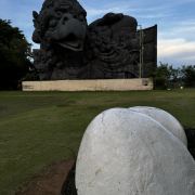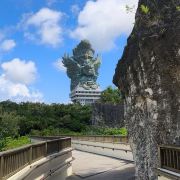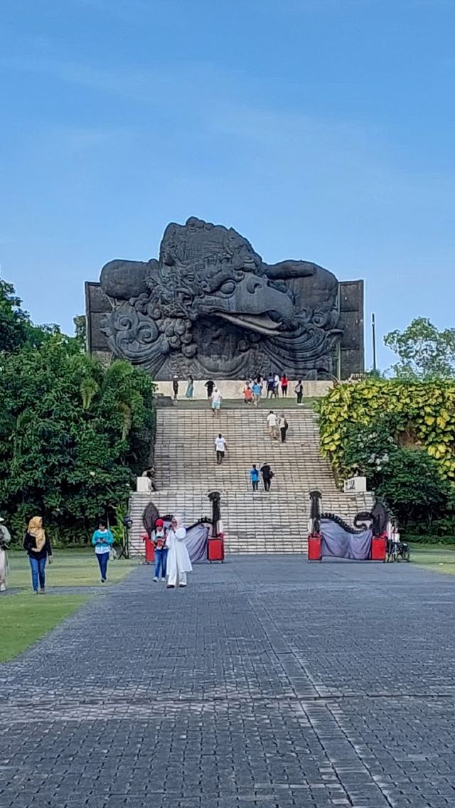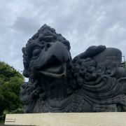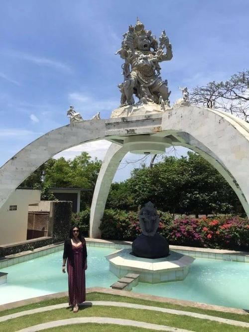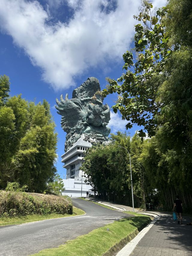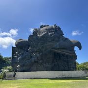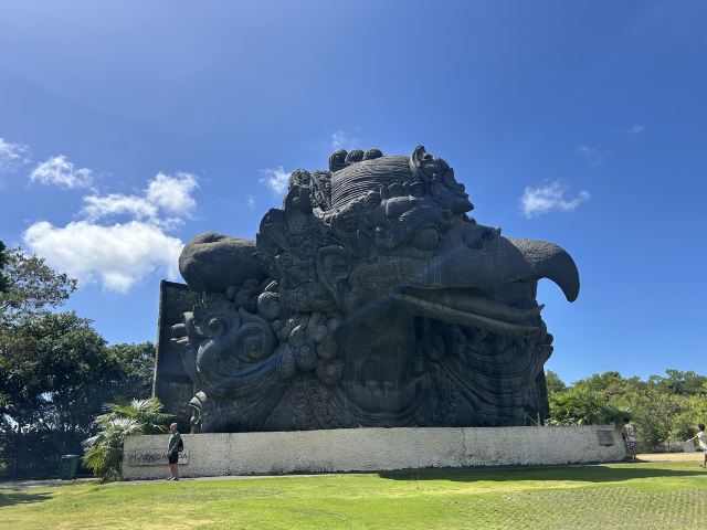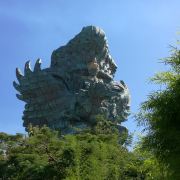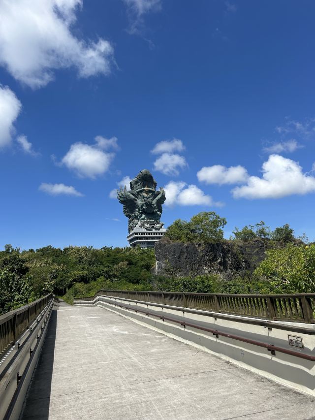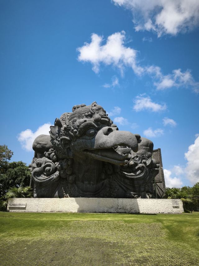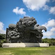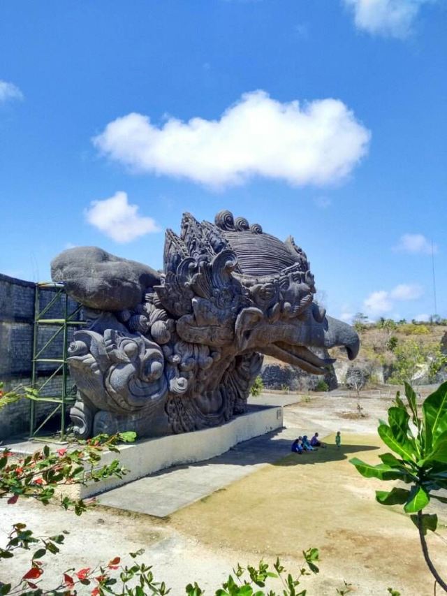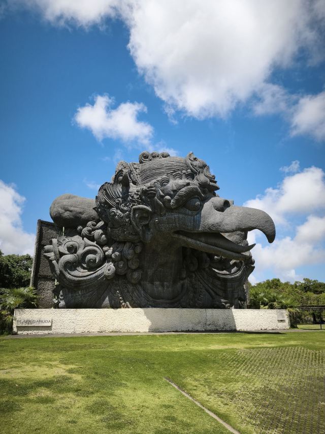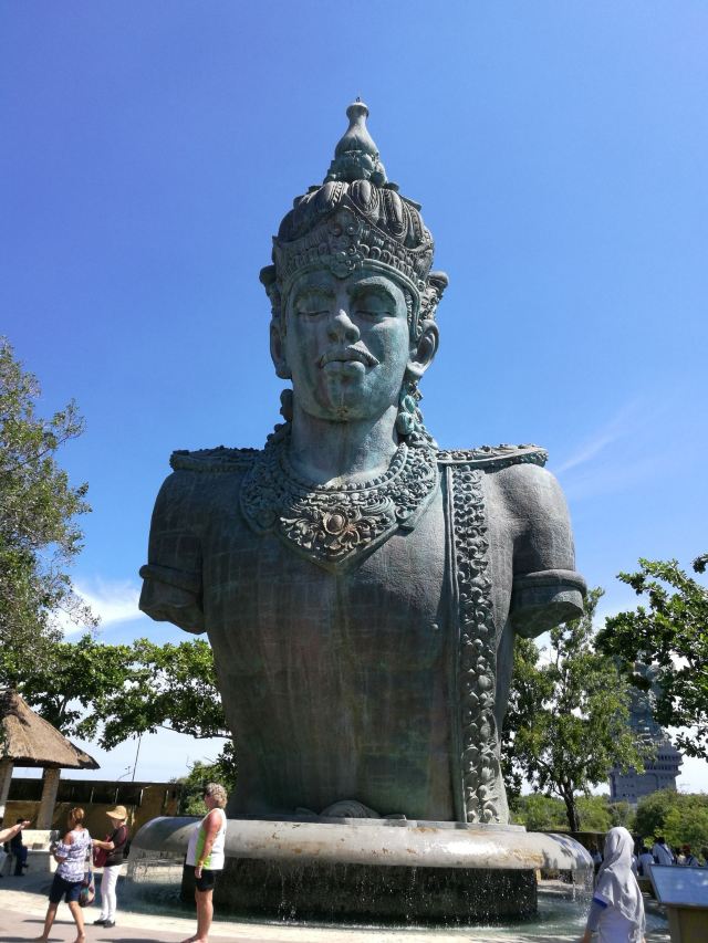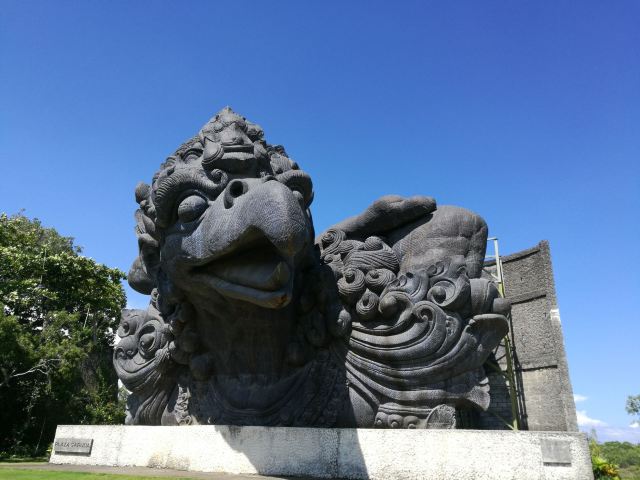尽管如此,神鹰广场文化公园这个“烂尾工程”依然值得一看,从金巴兰往南沿着Jl Uluwatu街可以来到神鹰广场文化公园所在的小山之下。进门后走阶梯登山,会看到头戴桂冠弯曲着修长身躯的神蛇盘在一侧。这座小山高约200米,当你来到山顶就可以看到巨大的“破坏神”毗湿奴(Vishnu)的铜像了,虽然只完成了头部和胸部,但栩栩如生的面部表情还是很有震慑力的。而“破坏神”的手臂则被放置在半山的一条小路旁,可以找找看。再往里头走,便会看到巨型神鹰的头部雕像俯视着眼前平坦的广场。这片广场是用大型挖掘机从山上往下挖出来的,广场四周高耸的整齐石壁上原本是要雕刻印度教铭文及神话人物故事的。