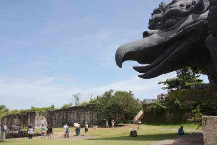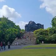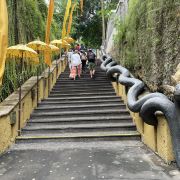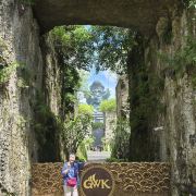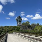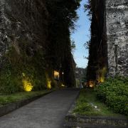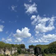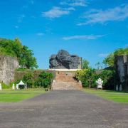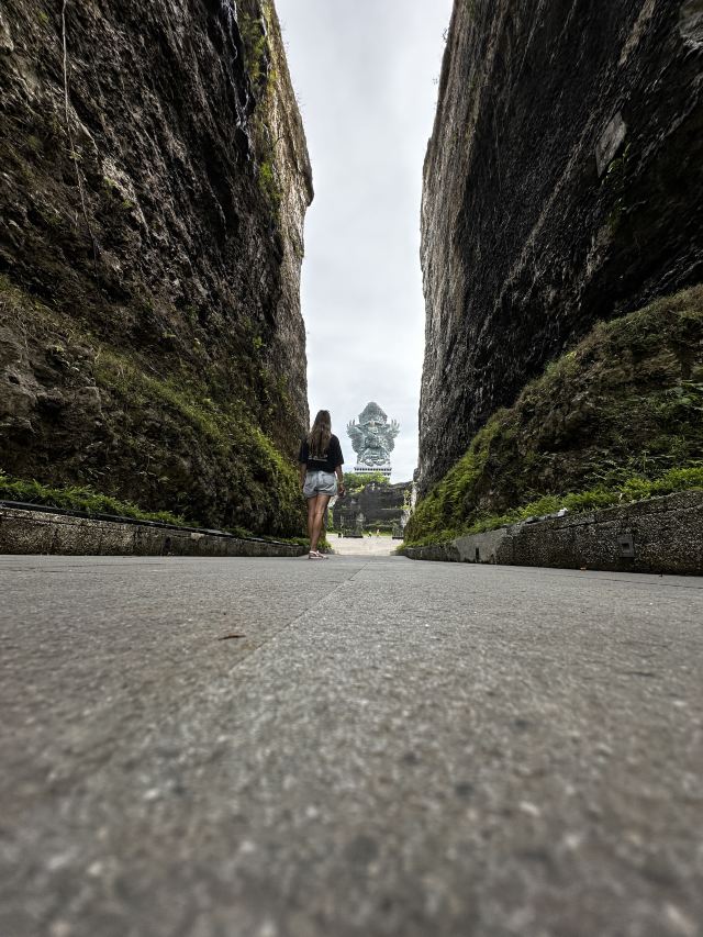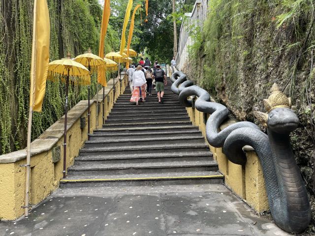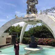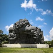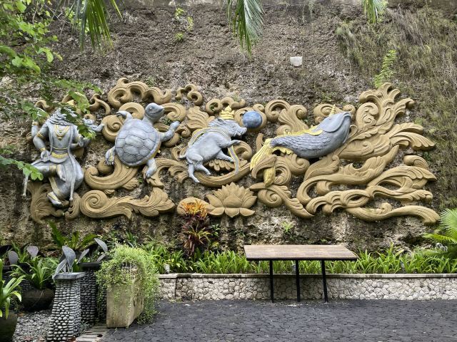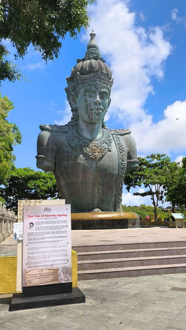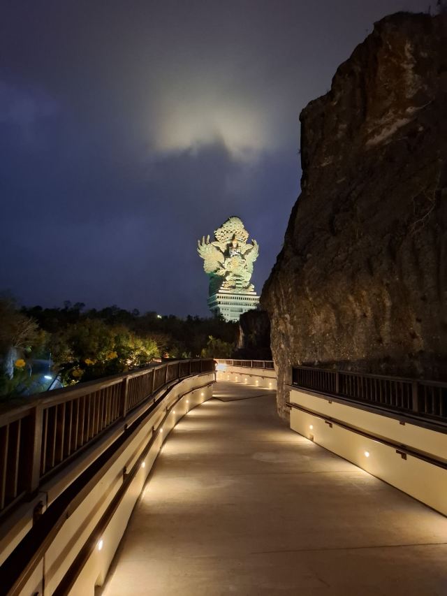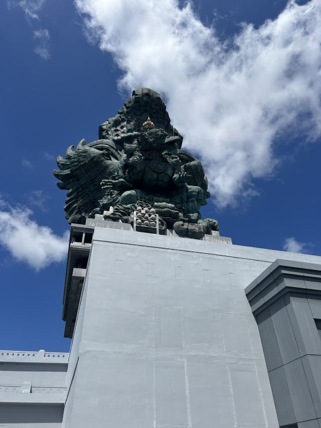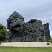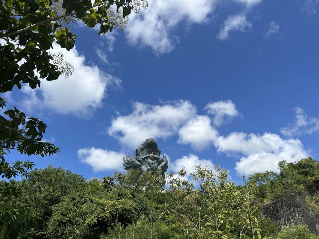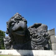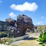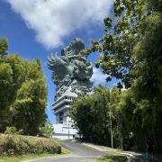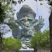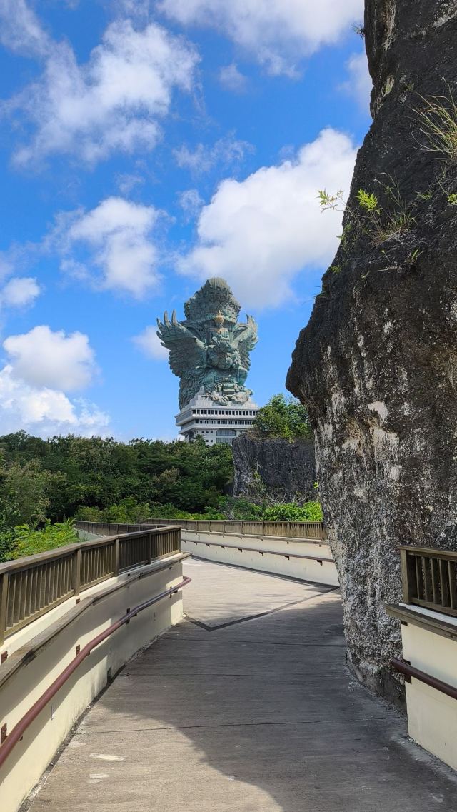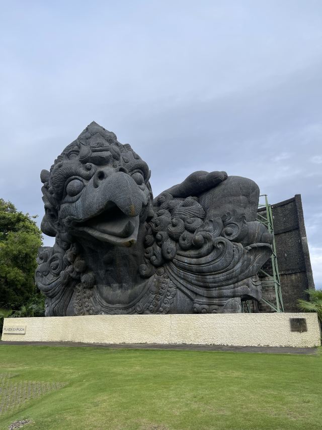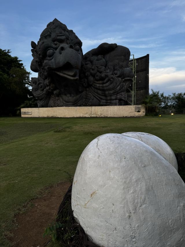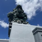 尽管如此,神鹰广场文化公园这个“烂尾工程”依然值得一看,从金巴兰往南沿着Jl Uluwatu街可以来到神鹰广场文化公园所在的小山之下。进门后走阶梯登山,会看到头戴桂冠弯曲着修长身躯的神蛇盘在一侧。这座小山高约200米,当你来到山顶就可以看到巨大的“破坏神”毗湿奴(Vishnu)的铜像了,虽然只完成了头部和胸部,但栩栩如生的面部表情还是很有震慑力的。而“破坏神”的手臂则被放置在半山的一条小路旁,可以找找看。再往里头走,便会看到巨型神鹰的头部雕像俯视着眼前平坦的广场。这片广场是用大型挖掘机从山上往下挖出来的,广场四周高耸的整齐石壁上原本是要雕刻印度教铭文及神话人物故事的。