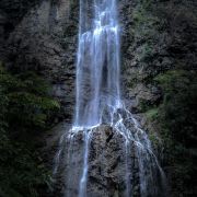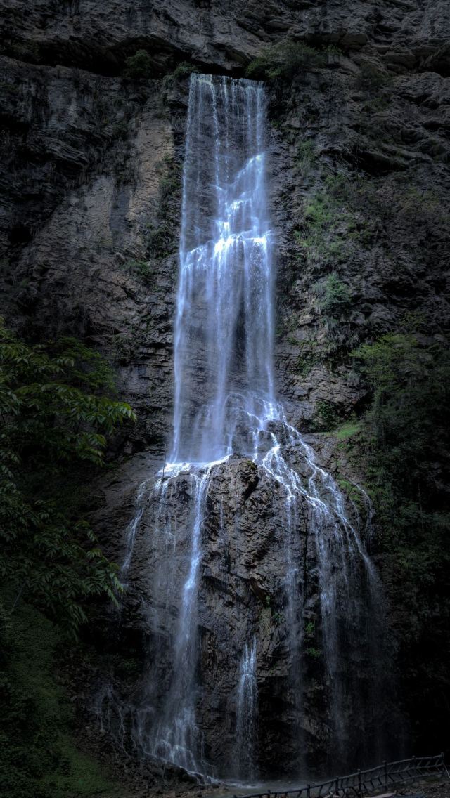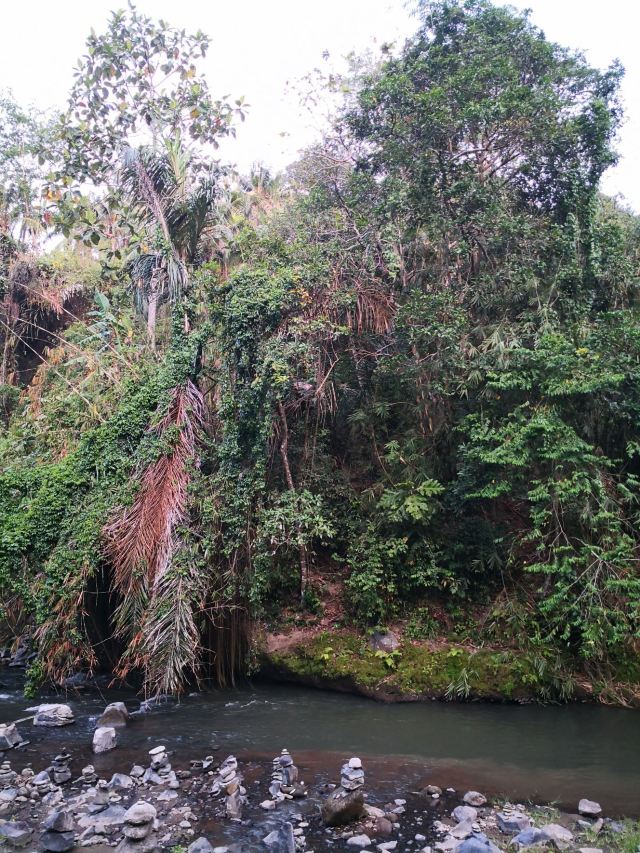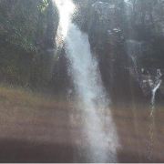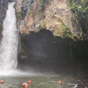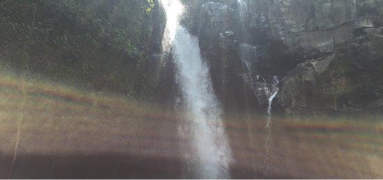 虽然瀑布的垂直高度不算太高,但瀑布周围丛林环绕,流水从山顶岩石上直泻而下,细腻清凉,溅起的水珠晶莹剔透,在阳光的折射下显得流光溢彩,异常美丽。山顶的树根和藤蔓顺着岩石而下,搭在满是绿藓的石头上,树叶的影子投射在瀑布上,美若世外桃源。