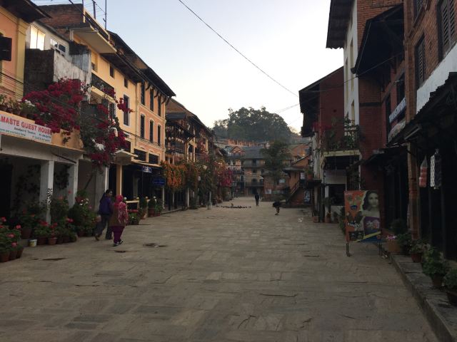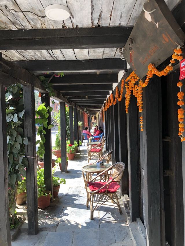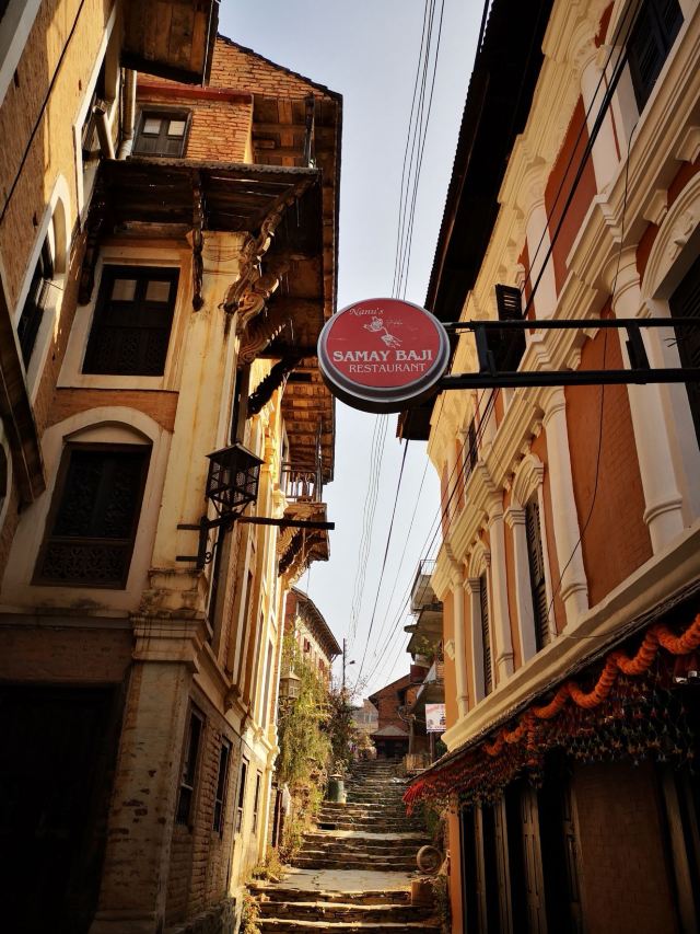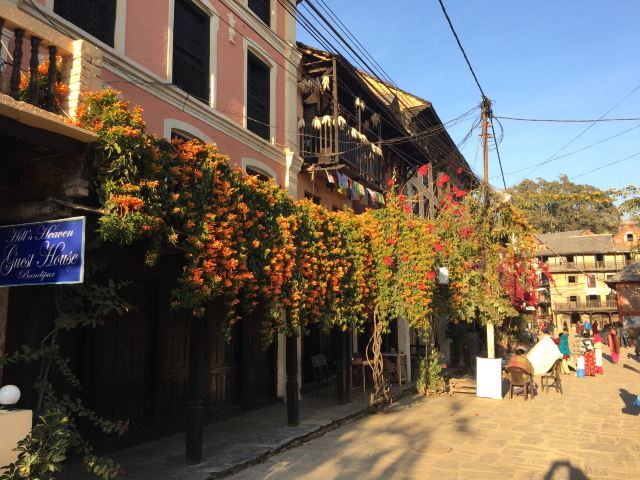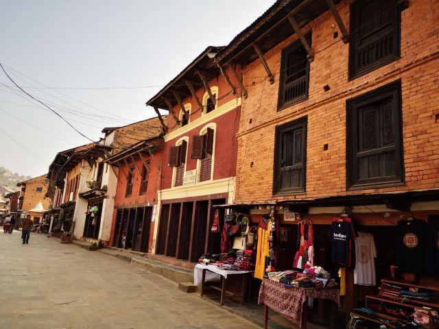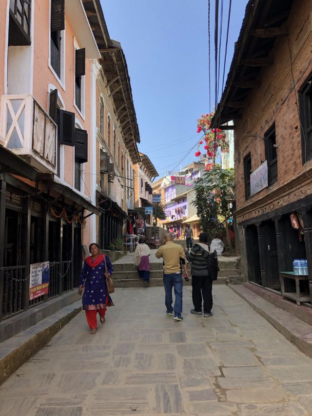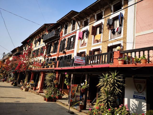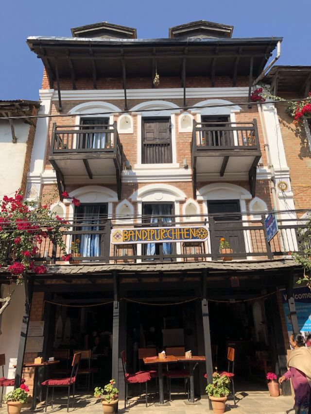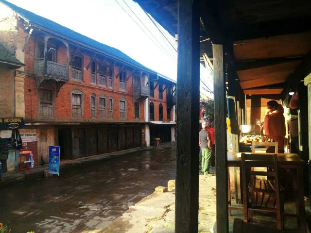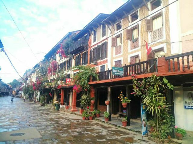 班帝普尔商业街,当地人俗称为Market,是一片面对着雪山的小街区。这里游人不多,街道上大多是闲适无比的当地人。街道的一头照例是尼泊尔随处可见的庙宇楼阁,宽阔的石板路两边错落分布着客栈、咖啡馆。坐在客栈的露台,边品尝尼泊尔的风味小吃,边欣赏远处的雪山,非常惬意。
