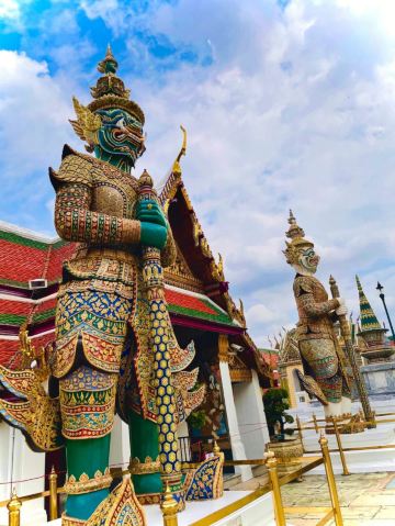 5分 超棒大皇宫景区可以说是泰国旅游必打卡的榜首。我在携程上预订了大皇宫+郑王庙双景点门票+讲解,导游是泰国当地人,但是中文非常好。参观当天天气很热,防晒霜、墨镜、帽子、雨伞、水都是必备品。因为是大热门景点,参观游客非常多。集合检票以后首先进入的是玉佛寺,玉佛寺的建筑极具泰国特色,泰国是一个佛教大国,对佛教的重视程度很高,建筑都是金碧辉煌,听导游讲解花在建筑外观上的金银珠宝就不计其数。导游讲了很久泰国国王的历史,讲了玉佛寺和历代皇室的关联,然后自由参观。玉佛寺中央的佛堂是要脱鞋进入的,内部禁止拍照。佛堂内部墙壁被壁画铺满,非常美丽,进来的游客席地而坐安静感受。出了玉佛寺后走入大皇宫,大皇宫园区有点像现代国家的总统府,庄园里有很大的空地,中央是一座豪华的府邸。因为一些历史原因,现在的泰王已经不住在大皇宫了,大皇宫被作为与******会晤的接待地点。