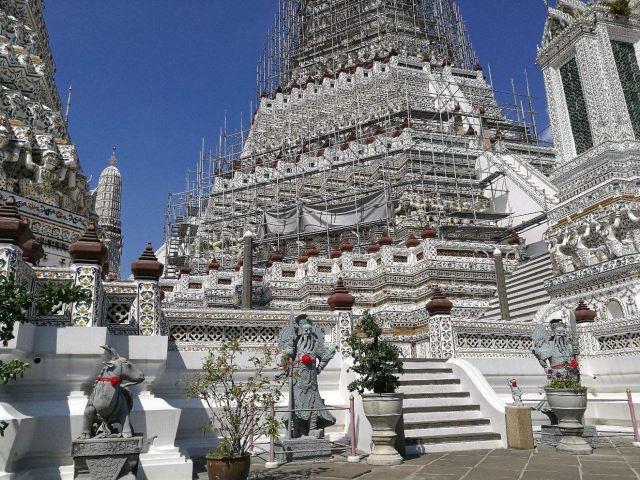主塔内有阶梯供游客攀爬,在塔上的观景平台上可以极目眺望湄南河对岸的大皇宫和曼谷市景。如果说这里的佛塔群在朝阳下显得熠熠生辉,那么当夕阳将整个区域映成琥珀色的黄昏时分,景色更加令人震惊。不管是在湄南河对岸,还是在佛塔脚下,摄影爱好者们都能捕捉到不同角度的美景。