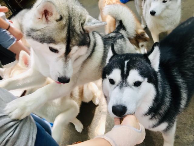 入场后就可以跟狗子们欢啦!跑来跑去不见生,太活络也很难拍到好看的照片,码子都很大,天热都在啃冰块吃!有个地方开始排队了,2人及以上可以组队一起入园跟n条一起拍照片,这个互动蛮带感的,就是狗子们太重了,重到不小心会摔个四仰八叉、囧!我手臂还被拉伤[发呆]居然还出了点血,店员说不要紧的,好吧[害羞]
