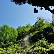 十悬峡是景区内另一条峡谷,因为谷内有几十处呈弧形的悬崖而得名,这条峡谷的特点在于较多的溪水瀑布和形状奇特的内弧形悬崖,行走在期间清新幽静。谷内有抻牛湖、水帘洞、不见天、怡心瀑、怪峰等景点。其中不见天即是由两侧弧形悬崖形成的奇特景观,非常特别。