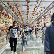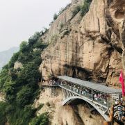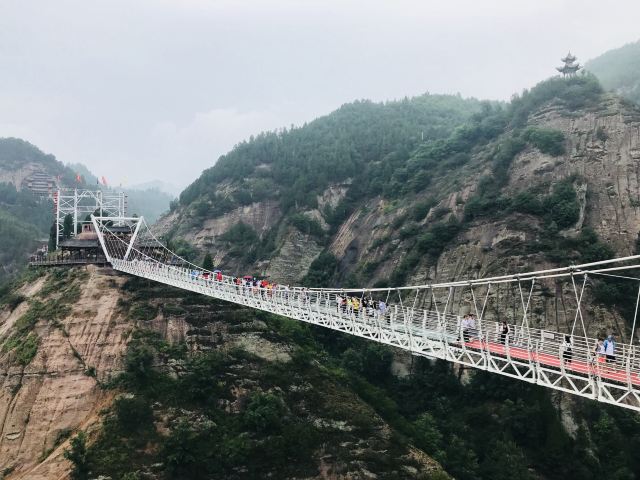 5分 超棒说到九龙山,那玻璃索桥自然不得不说了,270米的玻璃桥面再加上40米的悬空栈道,组成了这个西北最长的玻璃索桥。玻璃索桥恰如一道彩虹,横跨深谷之上,走在桥上,仿佛漫步云端,抬头,似乎伸手就能触碰到蓝天白云,低头,入眼便是奇峰峻峭,峡谷深凹,怪石嶙峋,丛林密布,丹霞地貌美的人挪不开眼,空气也是自然新鲜的不要说。想要看你胆大不胆大,高空玻璃桥,毫无疑问是最好的检测地。看看一起走在玻璃桥上的人们,或者扶着栏杆,战战巍巍的,或者是自己选的路,跪着也要走完的,有亦或者是尖叫着踉跄着的,当然,胆大者,悠游自在的享受其中的也有,站在桥上看风景的,拍照的,嬉戏的,真是一幅别有趣味的众生图。常说站得高,看得远,自然也就体验到了那些在地平线上无法感受到的震撼,自然的神奇,生命的渺小,世界的雄阔。
