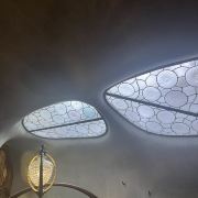 △ 大厅内部随处可见的是充满现代风味的工艺品。房间顶部是巨大的螺旋造型,像大海的漩涡一样,漩涡中心是海葵样的顶灯。一楼的大落地窗,可以俯瞰格拉西亚大道。另一面还有一个阳台,阳台的门口有个像人腿的立柱,通向一个现代主义风格的庭院,为各类大型活动提供了户外空间。