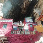 毗卢圣窟又叫麦若扎拉神洞,位于四川阿坝州马尔康查米村附近的一座海拔约4000米的山上,此山也被称为毗卢神山。传说这里曾是唐时藏族文学家、翻译家麦若扎拉修行的地方。清乾隆年间,六世仓央嘉措亦在此修行。寺庙建筑在山崖洞穴之中,除了大殿,还留有25处圣迹,如毗卢遮那的脚印、手印、留下的拐杖等。