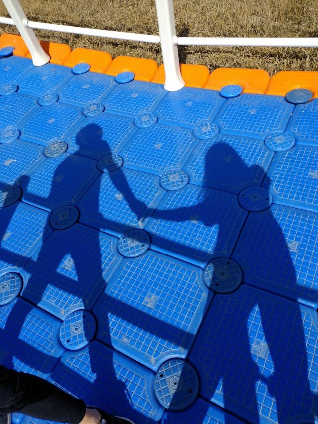 走进湖心,就可以看到工业区那边的橘黄色的浮桥边,是我们昨天走进去的地方。