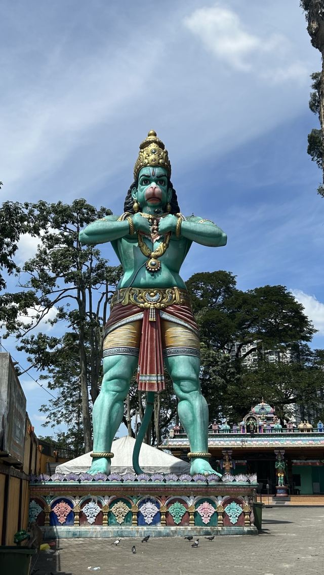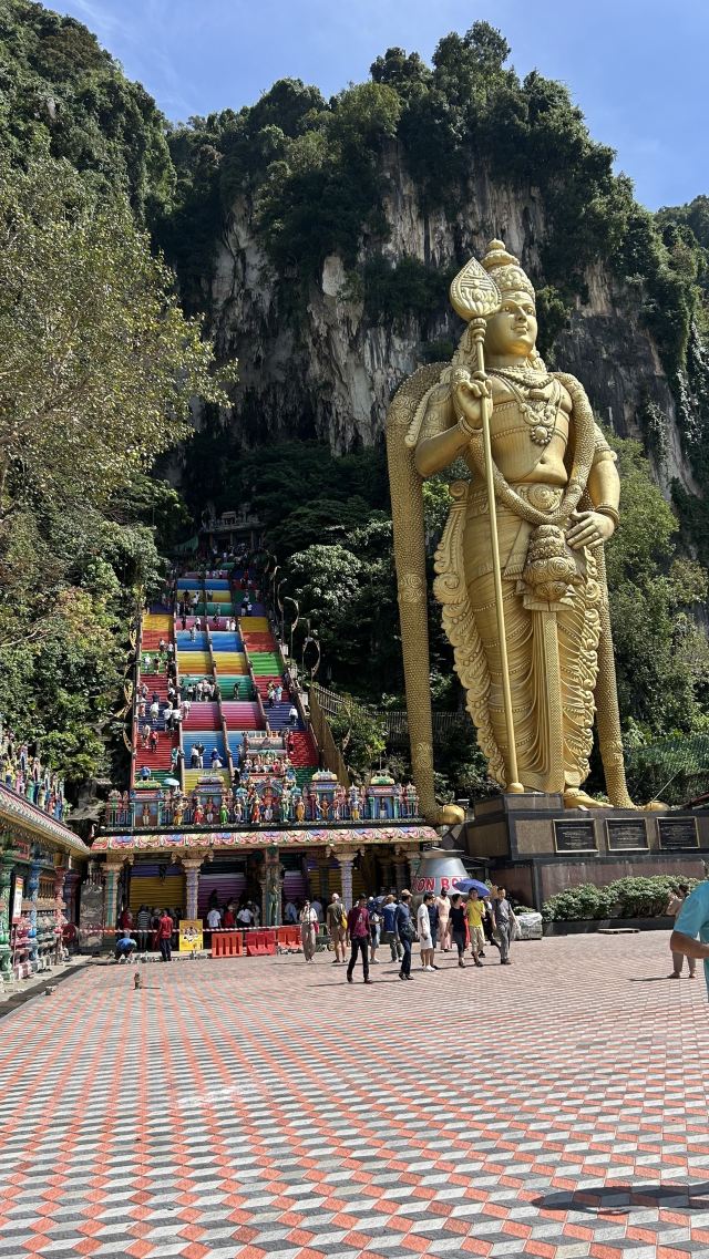在黑风洞前面矗立着一座巨大的镀金印度大佛战神MURUGAN神塑像,高达百余米。佛像前的广场上有许多鸽子,还可以看到许多印度教的神像及彩绘。