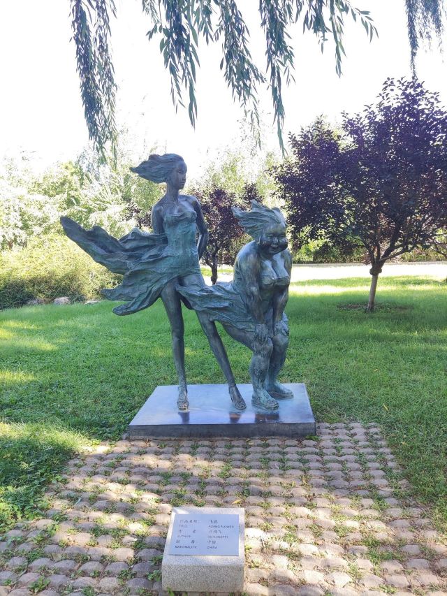 第一,当然是以观赏雕塑为主,园子里到处都有雕塑,沿路每走几步就能看到一处雕塑景观,大大小小,林林总总,各种题材都有,据说来自四十多个国家,名副其实的“国际雕塑园”。而且每一处雕塑前都有介绍,题目是什么、作者是谁、国籍哪里,如果要一处一处雕塑仔细看,那一整天也逛不完这座园子。