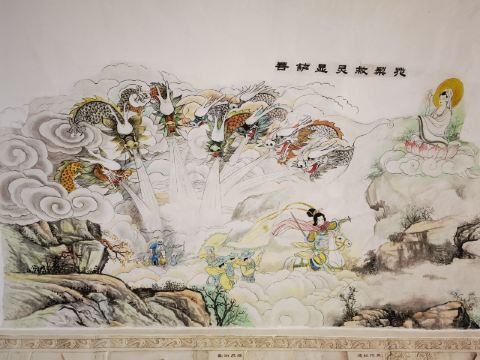 据观音寺碑文记载,该寺始建于唐代,明成化年间重修,至今已有1700多年历史。除大雄宝殿、大悲殿、圆通殿等人文景观外,寺庙周边的自然景观十分丰富,有神龟石、三星洞、香炉石、灵照松等。据民间传说,唐代著名女将樊梨花镇守幽州北境,一次与北国交兵,被困九龙山(即如今的圣泉山)下,敌强我弱,命悬一线。情急之中,樊梨花合掌急呼:“观世音菩萨显灵!观世音菩萨救我!”观世音菩萨闻听呼救,立即点化九龙山的九条伏地青龙,请它们施救,成就殊胜因缘。九条青龙欣然领命,立即兴风布雨,在军阵上空下起倾盆大雨。交战双方被大雨浇得睁不开眼抬不起臂,自顾不暇。乱军中,樊梨花率亲兵蒙头急奔,突围而去。事后,樊梨花感念观世音菩萨救命之恩,遂在九龙山云兴之处,为观世音菩萨建寺塑像,以为供奉。