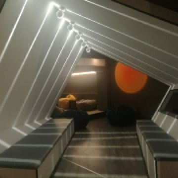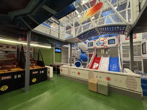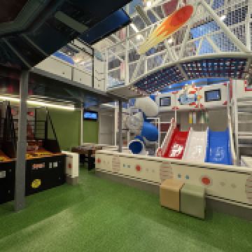 4F休闲娱乐区,独特设计风格的空间,网吧、电竞区、有Ps游戏可以选择;很适合一家三口娱乐,专门有儿童可以娱乐的乐高游戏区和粉红色的海洋球区域。儿童区域安全起见,地面铺的安全泡沫式的防护,可以安心玩耍。