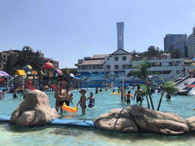海滨乐园占地9000多平方米,项目:造浪池(3000多平方米)、快乐岛(有五条彩色大理石滑道)、沙滩、游泳池(300平方米)、椰树休闲岛、水滑梯、儿童池(160平方米)、儿童戏水城堡、蘑菇喷啉、小海湾等。这京城之中的袖珍“海滨”虽是人造的,但造的逼真,造的有趣,造的安全干净。仅看它那清澈见底、发出深海般幽蓝的一泓碧水,就足以让人舒心、开心、放心的了。海滨乐园保证水质卫生 ,经有关部门多次年检,全部达到国家泳池水质卫生标准,池水24小时循环过滤消毒,确保游客的健康安全。更衣室淋浴用节能环保太阳能温水,现代电子自助存衣,训练有素的救生员为您保驾护航,让您尽情的在大海中畅游。