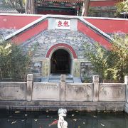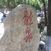进入寺门便是一雕栏方池,池壁以青石围砌,分外坚固洁净。池中碧水盈盈,清澈可鉴。它源自龙王殿下的拱形石洞,又经方池西壁石龙头口泻出,细流如注,经年不息。这水就是远近闻名的“龙泉”。院西有殿堂三楹,前有卷棚抱厦一间。殿厦构造都很精良别致。殿内供着泥塑彩绘龙王雕像,面呈威严、貌若帝王。旁边分列雷公、电母、风伯、雨师等群像,也都十分生动传神。这殿就是龙王堂。龙泉庵北部是另一组殿堂,由东向西依次为文昌阁、大雄殿、卧游阁和祖师堂。文昌阁正门朝东,前悬横匾 “俯瞰大千”;后悬横匾“得月先”。殿内供奉“伽蓝神”关公坐像。长髯飘飘,威风凛凛。大雄殿面阔三楹,大殿之中莲花宝座之上供释迦牟尼坐像,左右是阿难、迦叶尊者,三尊神像均为近年所作。大雄殿与文昌阁之间,南首西边是妙香室,东边是听泉小榭。小榭为敞厅式,精巧别致。大雄殿北边为闻妙香院,院内多植珍珠梅等花木,尤其是两架古藤萝,春夏之交,绿叶垂条,紫英缤纷,生机无限。