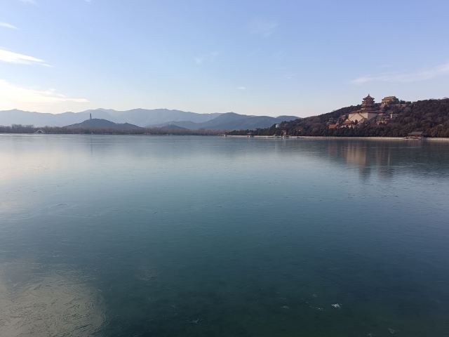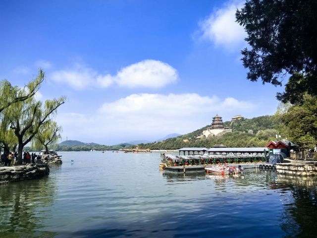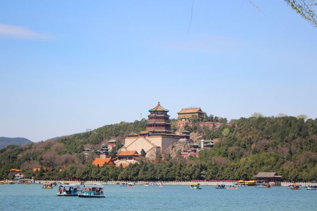 从北宫门进,往南过苏州街,后湖,到四大部洲,然后往西逛画中游,在山上赏昆明湖,望十七孔桥,欣赏听鹂馆的灰瓦屋顶建筑群。然后下山去码头坐船游昆明湖到东边。