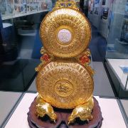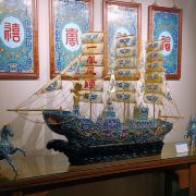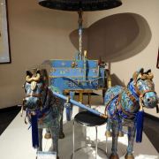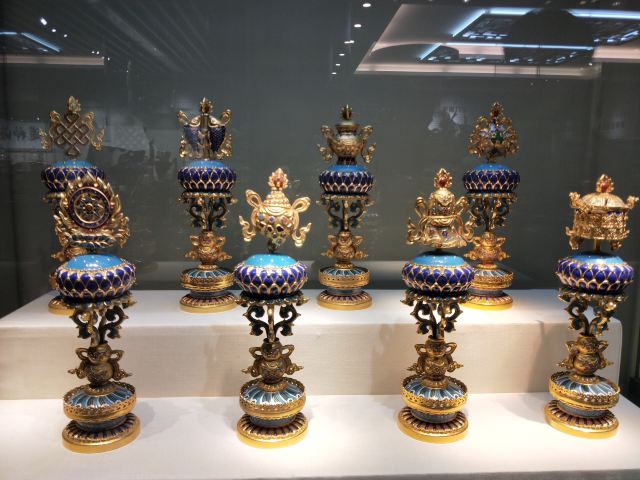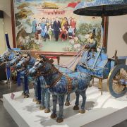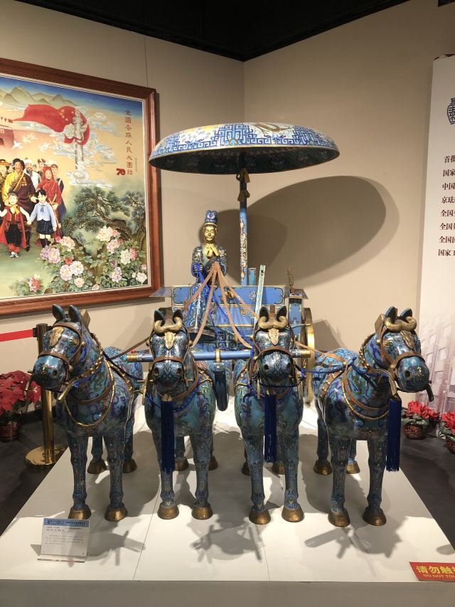 走进博物馆,就好像进入一个光怪陆离的世界,有泛着景泰蓝特有光泽的高仿秦始皇铜车马、红木景泰蓝如意、各式文房四宝、皇帝御座旁的香炉和仙鹤等。