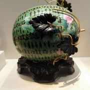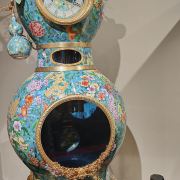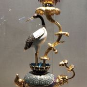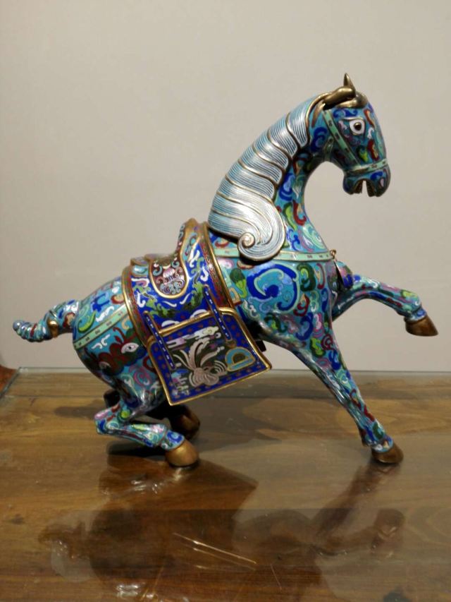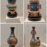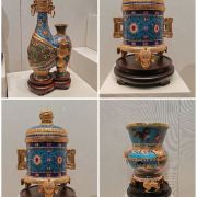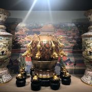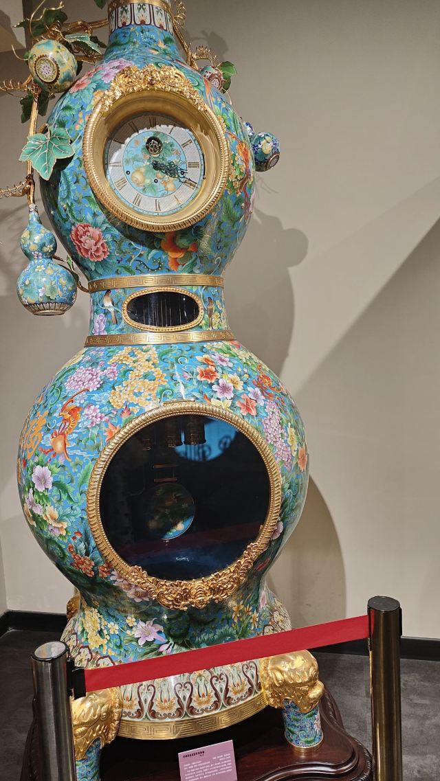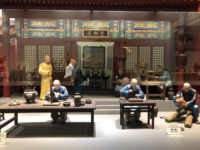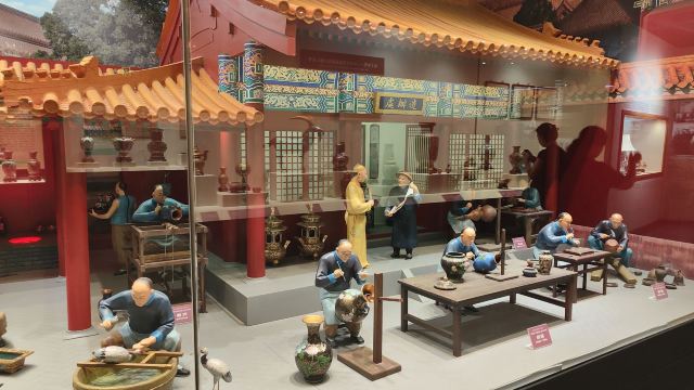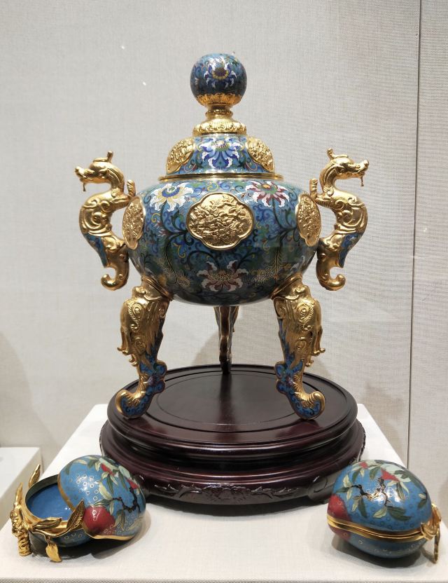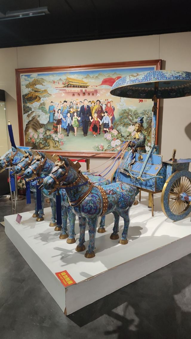 博物馆内以高仿元明清时期制作风格的珐琅器为主,令人叹为观止。泛着幽幽蓝光的秦始皇铜车马,精致华美的红木景泰蓝如意,各式文房四宝,还有皇帝御座旁的香炉和仙鹤,无不彰显着景泰蓝的精湛工艺和非凡魅力。