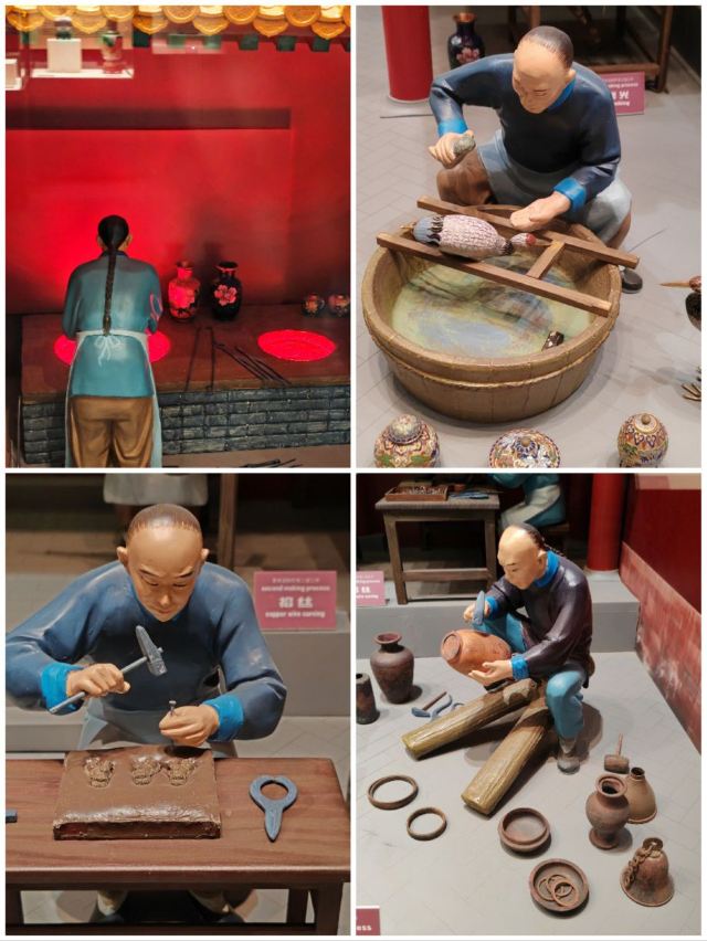 除了珍贵的藏品,博物馆还设有技艺展示和互动区域,让游客近距离感受景泰蓝制作过程。大师、高级技师、传承人现场演示着这项古老技艺的精髓,将铜胎掐丝、点蓝、烧蓝等步骤展现得淋漓尽致。