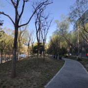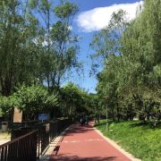 公园有一条长达3.5公里的健康步道,呈“之”字形贯通长河南北两岸,平整的步道中间是砖面,两边铺有小碎石;公园外侧是红色的千余米专业骑行道,直通西三环。