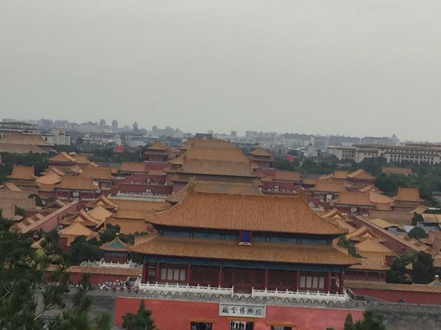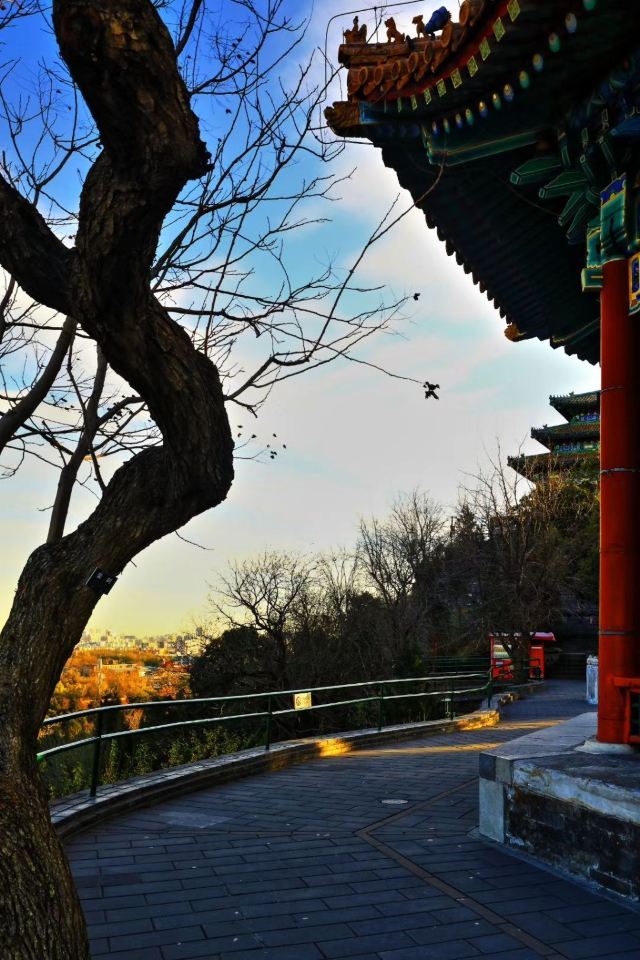 登上公园的万寿亭可以俯瞰整个北京城,望南可以看到故宫的全景;望北可以看到中轴线上的钟鼓楼;向西看则有北海的白塔,东南方可以看到中南海。在亭子的前方有一个圆形的铜质地标,写着北京城中心点。