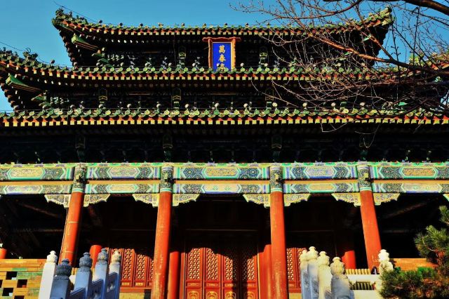 万春亭内供奉着“毗卢遮那佛”,毗卢遮那佛也称为大日如来佛,是释迦牟尼佛的法身。毗卢遮那佛为密宗金刚界五方如来之首,在五方佛中代表法界体性智。亭中所供原佛像于二十世纪六十年代被损毁,重塑归安后于2000年正式对外开放。