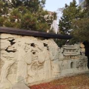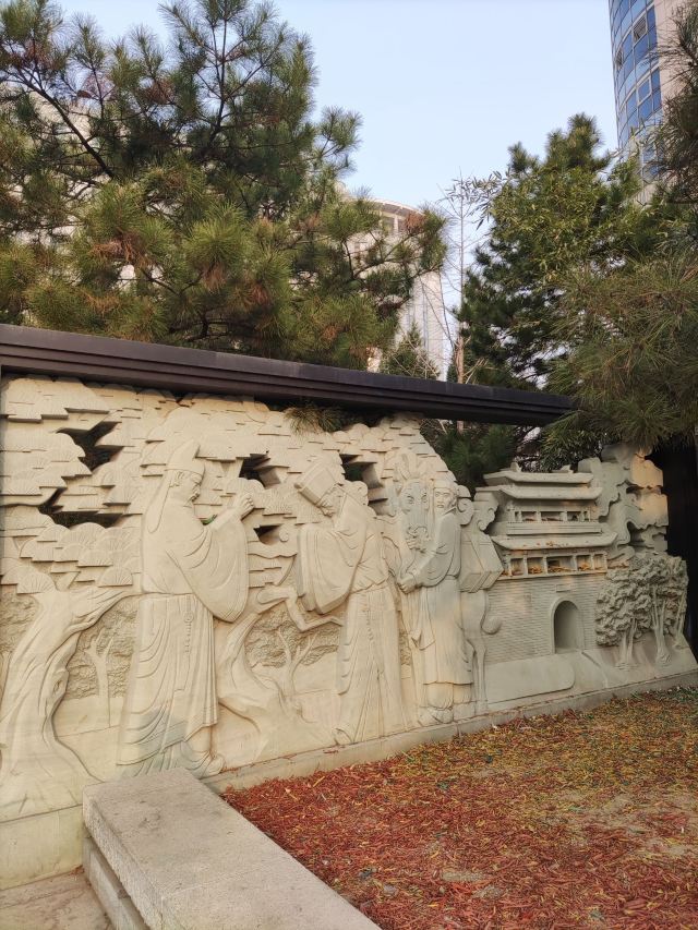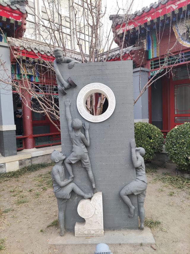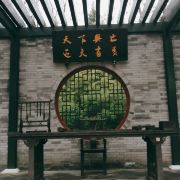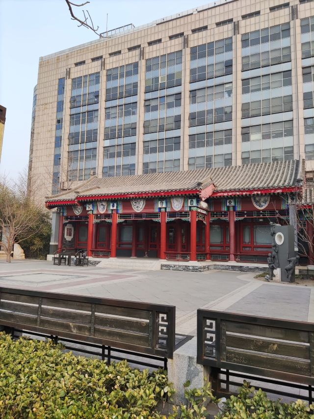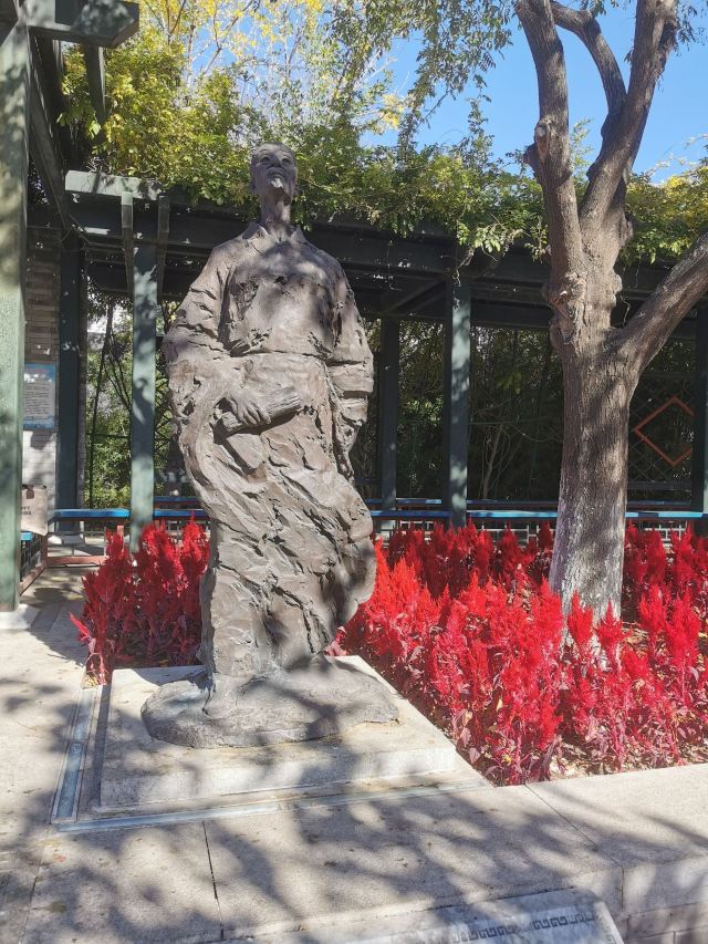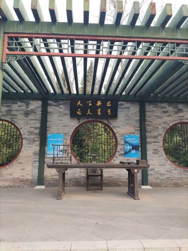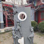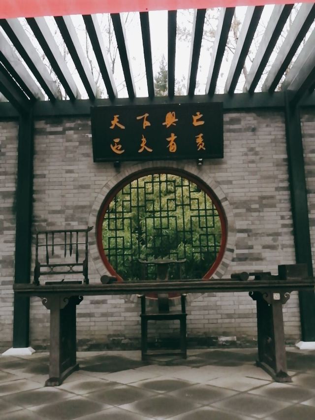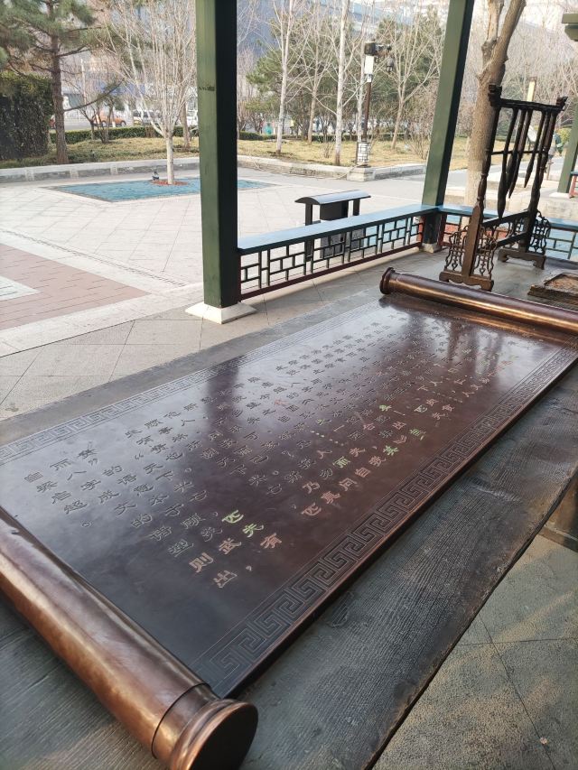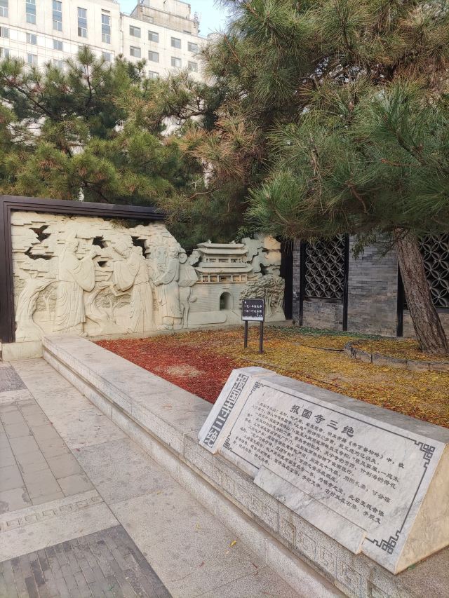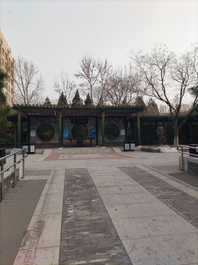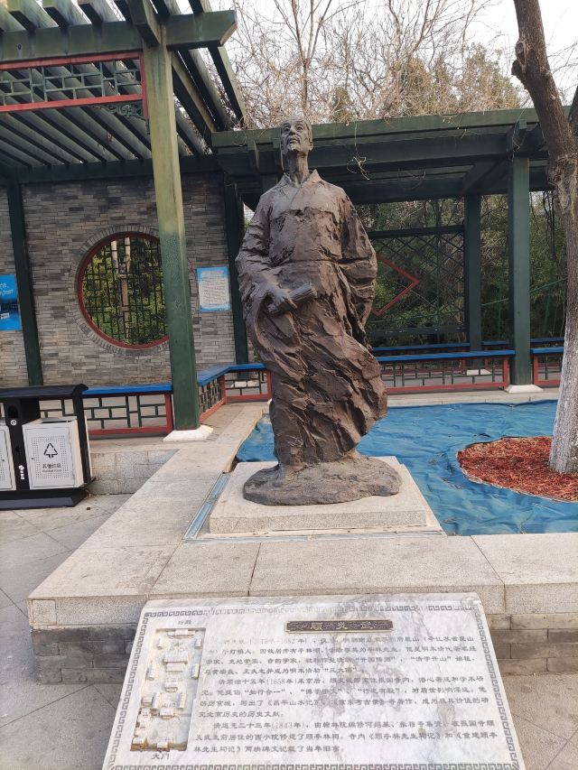在这小小的广宁公园里,核心景观是顾炎武的立像,顾炎武是明末清初著名的思想家、经学家、史地学家、音韵学家,被尊为“亭林先生”,清初“三大儒”之一,知识渊博、在众多领域皆有著作,且为人忠直,一生坚持抗清活动,不就清朝的官职,“天下兴亡匹夫有责”的名句正出自顾炎武,原话是“保天下者,匹夫之贱,与有责焉耳矣”。清顺治十五年顾炎武来京后即居住在报国寺内,潜心著作及学术研究,提倡“知行合一”、“博学于文”、“行之有耻”,并游历京城,在北京历史、地理等方面均留下了众多文献。清道光年间,由文人集资在报国寺内建顾亭林祠,位置在报国寺山门外、大门内,正是如今广宁公园所在位置。在顾炎武立像身后,还布置了顾炎武书桌的背景,以及“天下兴亡匹夫有责”的牌匾,算是缅怀这位有气节的历史名士。在公园西侧,有一个小广场,有小童玩空竹的布景(在北边胡同里就是很“迷你”的空竹博物馆),还有对于“报国寺三绝”的介绍,如果有时间可以抽出半天在这一带转转,报国寺、广宁公园、空竹博物馆都可以逛上一逛,这附近小吃也不少。