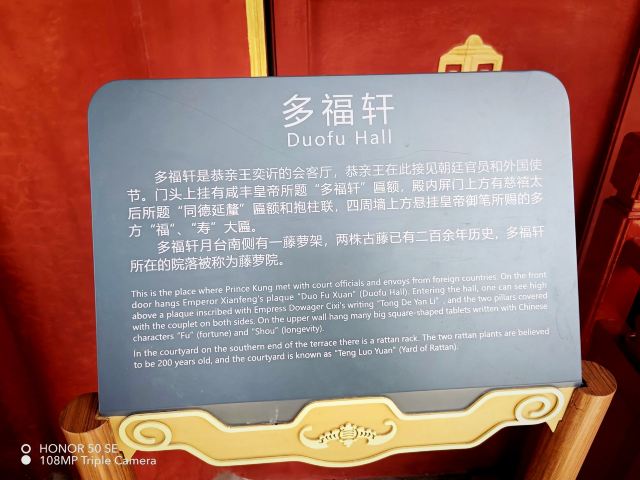 ②多福轩:奕䜣的会客厅,轩名为咸丰帝手书,轩内匾额“同德延釐”为慈禧太后手书。