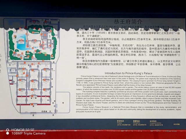 2、恭王府始建于清乾隆四十二年(1777年),原址是明代旧园,3年后御赐此地给和珅,和珅用时4年建成此府;嘉庆四年(1799年)和珅被赐死抄家,宅邸赐予庆王爱新觉罗•永璘,共传承5代;道光三十年(1850年),恭亲王爱新觉罗•奕䜣被御赐此府,2年后搬入,传承2代;民国元年(1912年)清帝退位后,恭王府及府内资产归属王公;民国二十六年(1937年),王府主人爱新觉罗•溥伟(奕䜣之孙)病逝后,王府被拍卖给辅仁大学;新中国成立后王府先后被多座院校使用,1962年重修后对外开放。