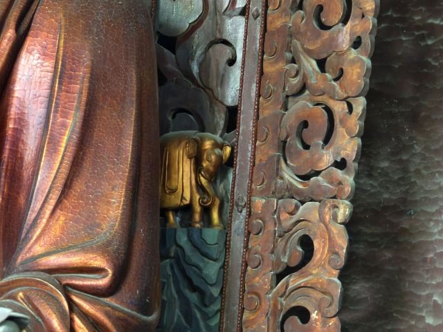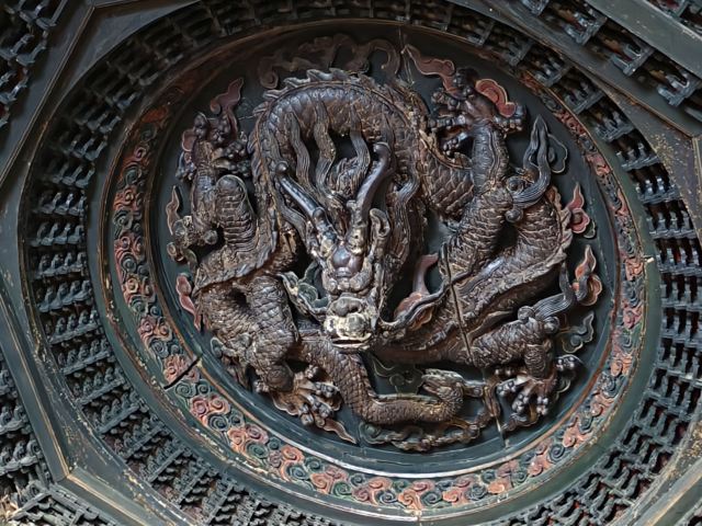 二进院正殿是大雄宝殿,也是大觉寺的主殿,匾额书写“来去无处”是乾隆御笔。殿内井口天花绘莲花瓣,藩龙藻井,这也是大觉寺唯一的一座藻井,雕刻非常精美。